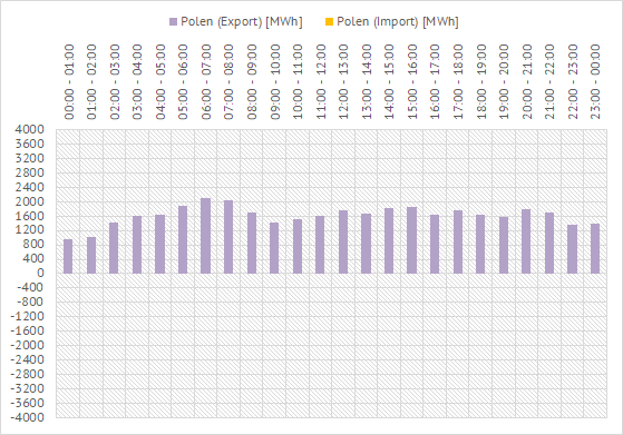 | Dargestellt sind die über eine Zeitstunde aufsummierten viertelstündlichen positiven und negativen Energieflüsse [MWh]. Gelbe Balken bedeuten Import, lila Balken bedeuten Export von Elektroenergie aus dem und in das dargestellte Nachbarland zwischen den jeweiligen Tagesstunden. | ||||||||||||