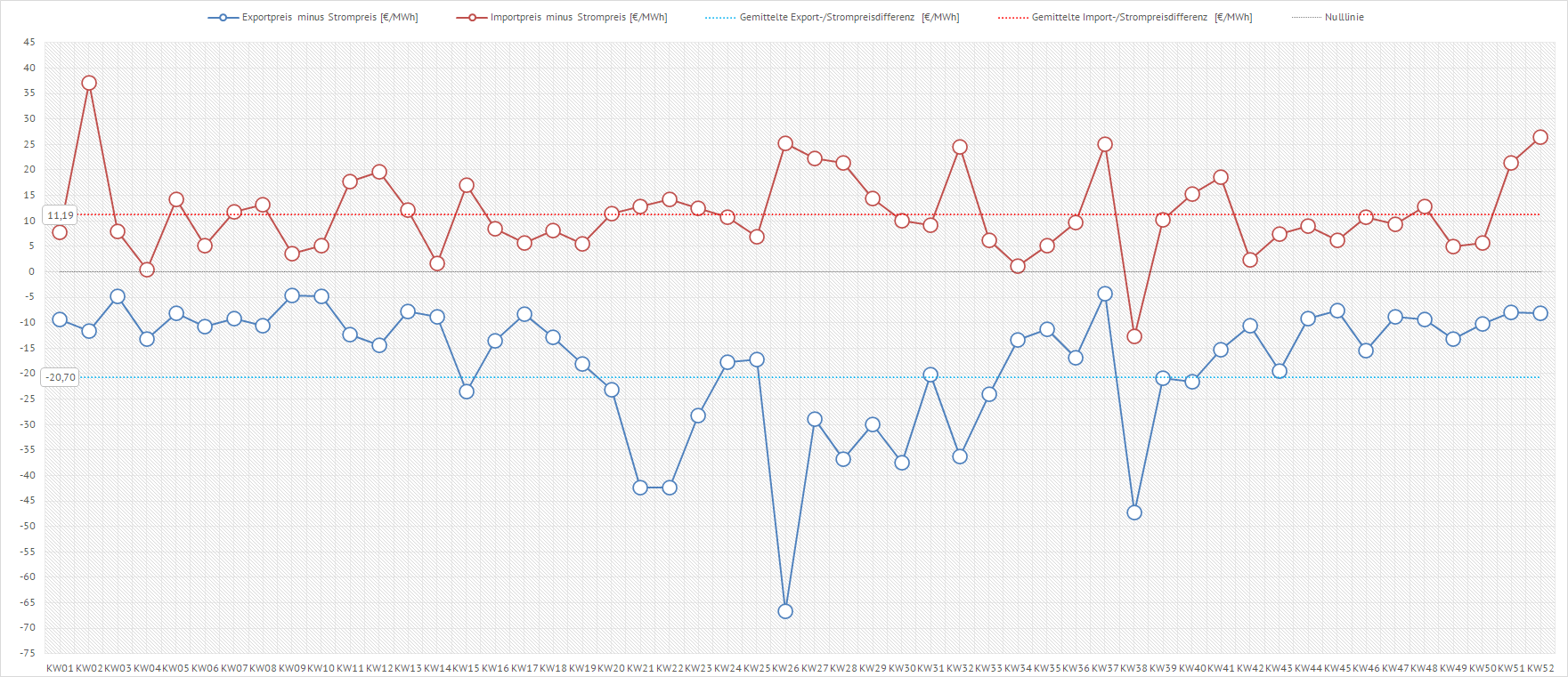 | Abweichungen des mittleren Großhandelsstrompreises von den Exporterlösen und von den Importzahlungen [€/MWh] im Jahr 2023 | ||||||||||||