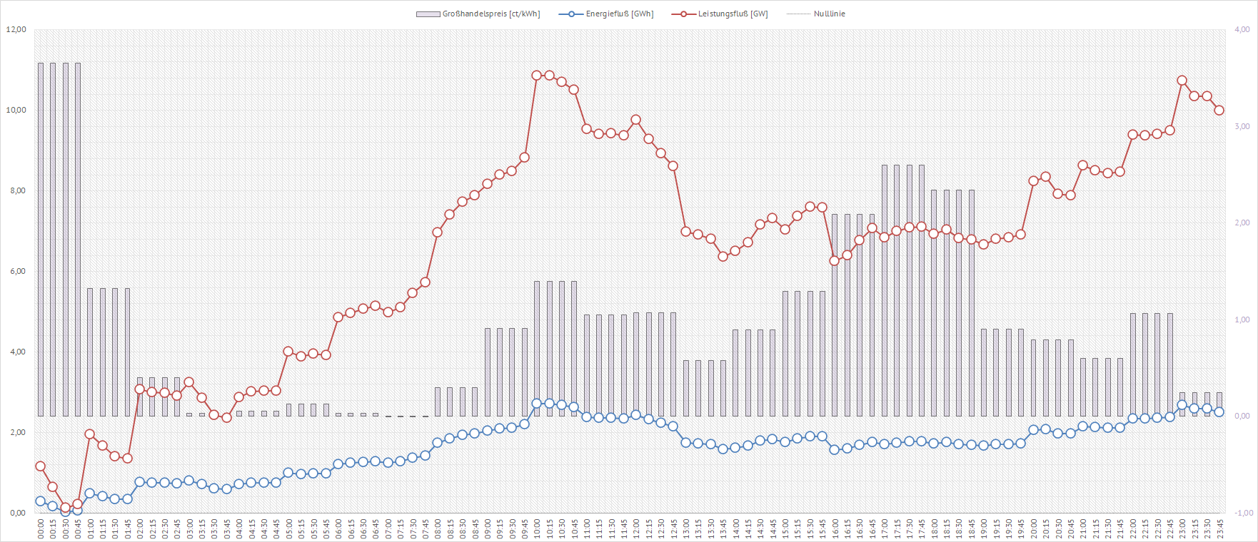 | Angezeigt wird der über eine Viertelstunde gemittelte Leistungs- und Energiefluss sowie die aufsummierten Export- und Importenergiemengen über den gesamten Tag [positive Werte --> Stromexport / negative Werte --> Stromimport]. Des Weiteren werden die stündlichen Großhandelspreise für die gehandelten Strommengen angeführt. Die rechte Skale in der Grafik zeigt den Großhandelsstrompreis in ct/kWh. | ||||||||||||