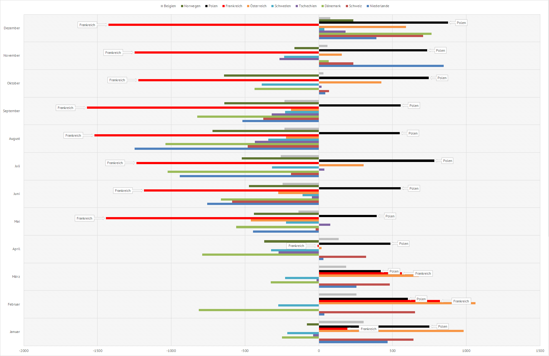 Monatliche länderspezifisch exportierte und importierte Strommengen aus und nach Deutschland [positive Werte --> Stromexport / negative Werte --> Stromimport] |