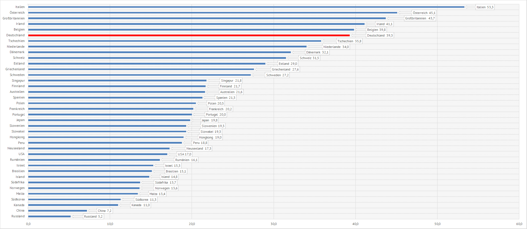 | In Deutschland ist der Strompreis für private Haushalte aktuell mit durchschnittlich 31,8 ct je verbrauchter kWh weltweit unter den G20-Staaten am höchsten. Bezogen auf den durchschnittlichen Strompreis von 13,13 ct/kWh in den G20-Staaten, beträgt davon der durchschnittliche Strompreis in Saudi Arabien lediglich 30 %. | ||||||||||||||||||||||||||||||||||||||||||||||||||||||||||||||||||||