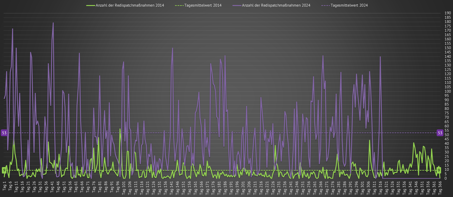| Dargestellt ist die Anzahl der täglich im aktuellen Jahr von den Übertragungsnetzbetreibern veranlassten Redispatchmaßnahmen für die notwendige Netzstabilität. Es sind die Tage dargestellt, an denen eine Redispatchmaßnahme gestartet wurde. Im Vergleich ist die Anzahl der täglich gestarteten Redispatchmaßnahmen aus dem Jahr 2014 dargestellt. Es ist offensichtlich, dass die Anzahl der Maßnahmen deutlich geringer war. Im Mittel benötigten die Übertragungsnetzbetreiber im Jahr 2014 täglich nur 9 Netzeingriffe, im Jahr 2025 sind es im Mittel täglich 53 Netzeingriffe. | ||||||||||||||||||||||||