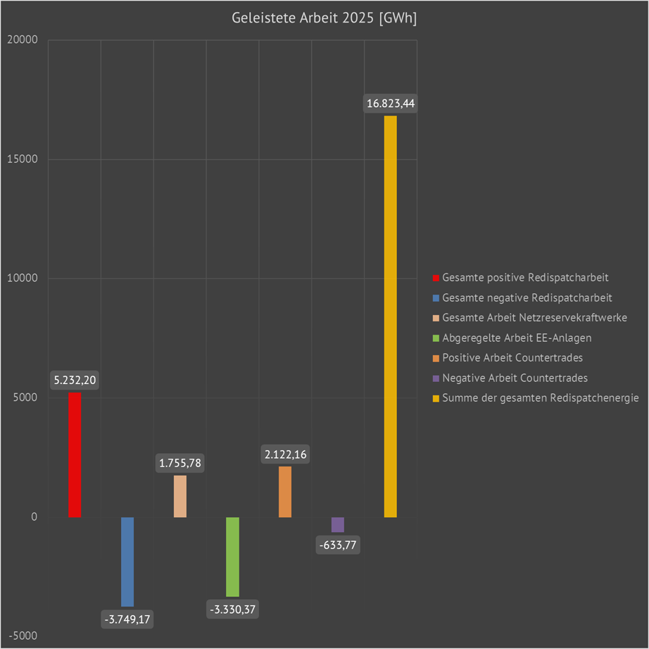 | Leistungs- und Energieeinsatz für die positiven und die negativen Redispatchmaßnahmen im Jahr 2025 | ||||||||||||||||||||||||