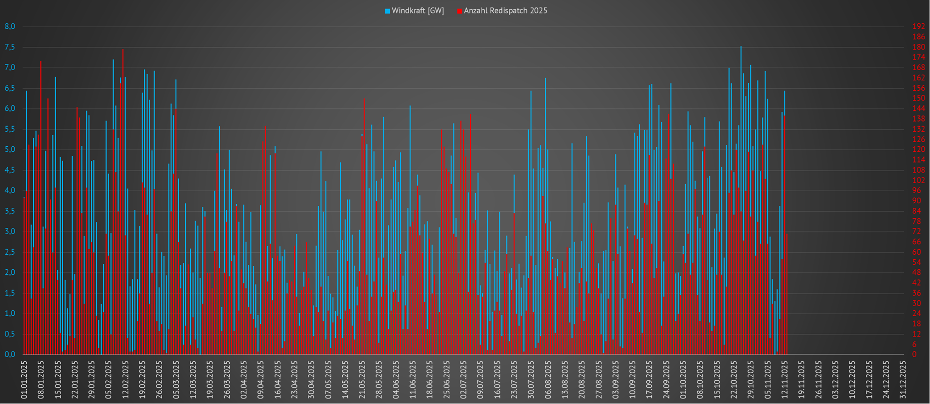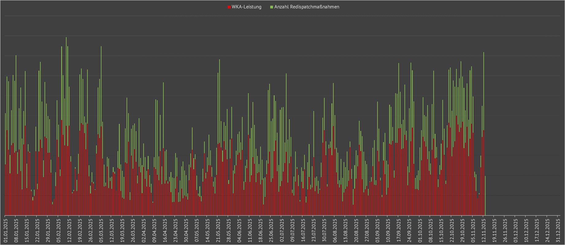 | Monatliche Anzahl der Redispatchmaßnahmen versus eingespeister Windkraftleistung in Deutschland im Jahr 2025 | ||||||||||||||||||||||||