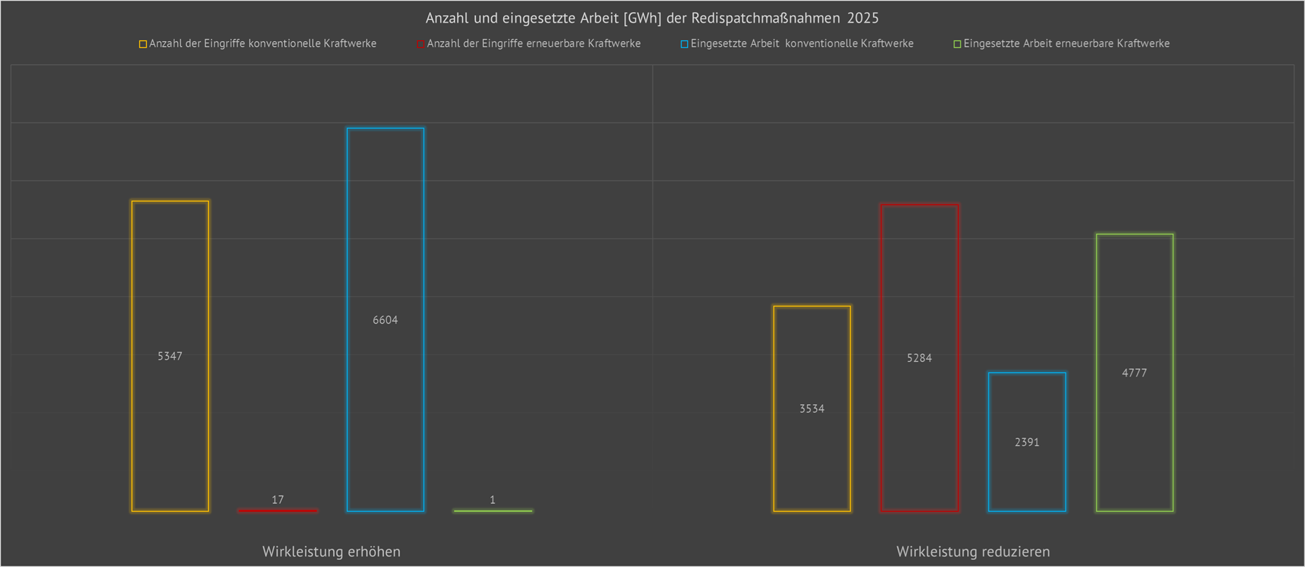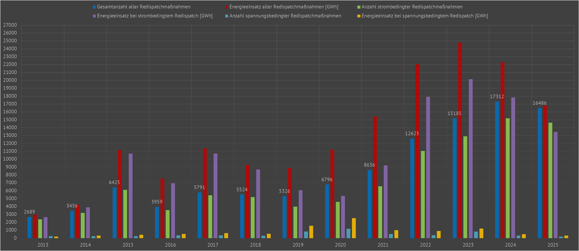 | Hier werden die jährlichen Redispatchmassnahmen (strombedingt, spannungsbedingt) aller deutschen Übertragungsnetzbetreiber dargestellt. Zum Beispiel waren im Jahr 2023 12907 strombedingte und 838 spannungsbedingte Redispatchmaßnahmen notwendig. Dafür wurde eine Gesamtenergiemenge von 2,4813 TWh eingesetzt. | ||||||||||||||||||||||||
