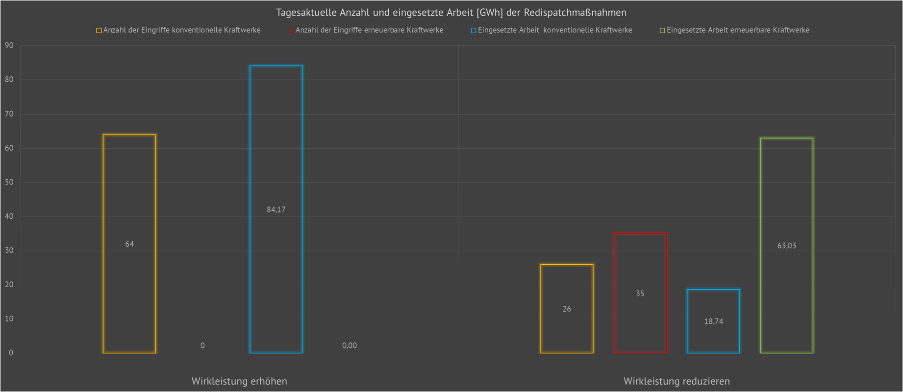 Hier werden die tagesaktuellen Redispatchmassnahmen (Leistungserhöhungen, Leistungsreduzierungen) und die daran beteiligten Anlagen dargestellt. Dabei bedeuten positive Leistungswerte eine Wirkleistungssteigerung und negative Werte bedeuten eine Wirkleistungsreduzierung. Die verrichtete Arbeit (Energieeinsatz) ergibt sich aus der Multiplikation der Zeit mit dem dargestellten Mittelwert der positiven oder negativen Leistung. Die rechte Skale stellt die Zeitwerte in Stunden dar. Die gelben Stundenbalken zeigen die Abregelungen der jeweiligen Offshore-Windparks durch die Netzbetreiber an. Die grünen Balken zeigen diese Abregelungen für die Solar-Kraftwerke und die Onshore-Windkraftanlagen an. Die lila Balken zeigt die Zeitdauer nach dem Einschalten der Netzreserve-Kraftwerke an. Die unterste horizontale Zeitachse zeigt die Startzeit der jeweiligen Redispatchmaßnahme an. Zu den jeweiligen Starzeitpunkten gehören dann die entsprechenden Stundenbalken (blau, grün, gelb, lila), also die jeweilige Zeitdauer der angestoßenen Redispatchmaßnahme. Hinweis: UW bedeutet Umspannwerk. OWP bedeutet Offshore-Windpark. |