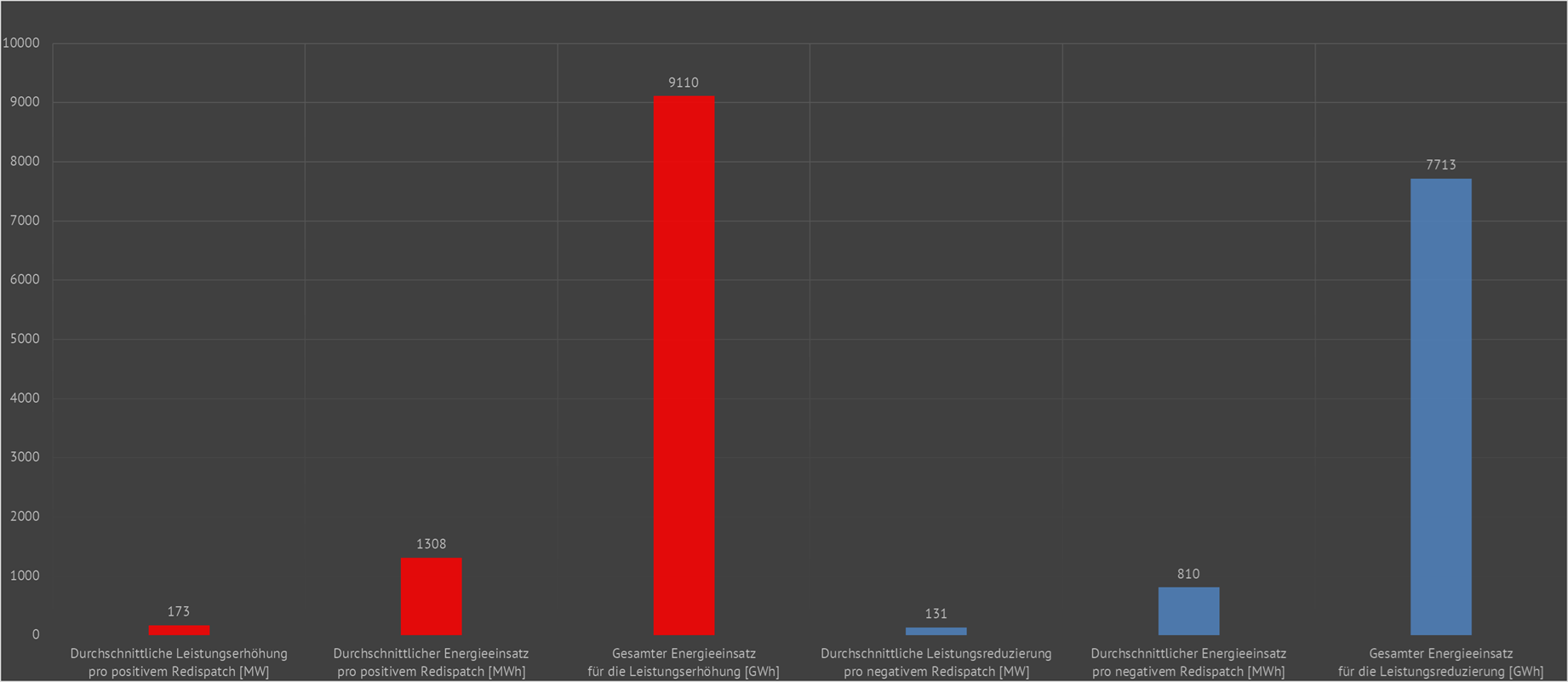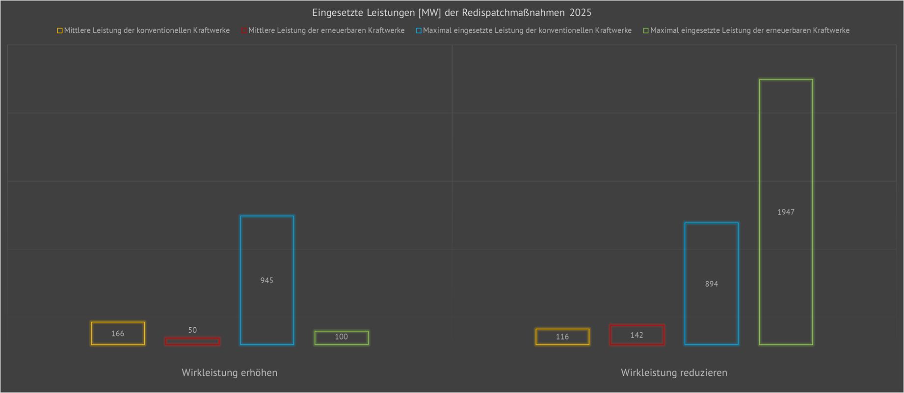| Im Jahr 2024 wurde bisher für jede positive Redispatchmaßnahme (Leistungserhöhung) eine durchschnittliche Leistung von 173 Megawatt eingesetzt. Diese 196 Megawatt flossen im Schnitt 8 Stunden und erforderten dabei eine Energiemenge von 1308 MWh. | ||||||||||||||||||||||||