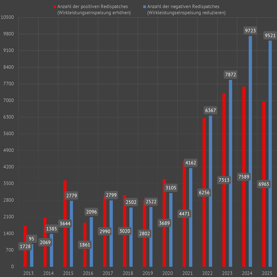 | Anzahl der positiven und der negativen Redispatchmaßnahmen im Jahresvergleich | ||||||||||||||||||||||||