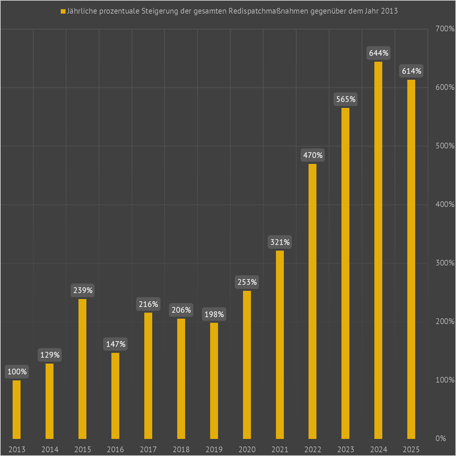 | Dargestellt ist die jährliche Korrelation zwischen Windkraftanlageneinspeisung und den daraus resultierenden Redispatchmaßnahmen. Es ist deutlich zu erkennen, dass die Anzahl an erforderlichen (und preisintensiven) Redispatchmaßnahmen proportional mit der Leistung der einspeisenden Windkraftanlagen zunimmt. Im Umkehrschluß bedeutet das, umso mehr unstetig produzierende Windkraftanlagen in Deutschland einspeisen, desto mehr kostspielige Redispatchmaßnahmen müssen für den Erhalt der Netzstabilität durchgeführt werden. Es ist also zu konstatieren, dass vorwiegend die volatilen Windkraftwerke ursächlich für die erforderlichen Redispatchmaßnahmen sind. | ||||||||||||||||||||||||