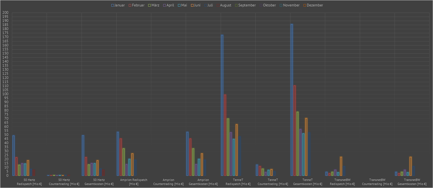 Amprion, TenneT und TransnetBW. Dazu heißt es bei entso-e: "In accordance with the definition in Art. 2 (26) of EU Regulation 543/2013, the costs for redispatching for Germany include as well the costs of multilateral remedial actions (MRAs), interruptible loads, feed-in management of renewables and activation of reserve power. As there is currently no legal basis with regard to the amount of compensation for the settlement of redispatch costs in Germany, the displayed costs are preliminary values and may be subject to updates." |