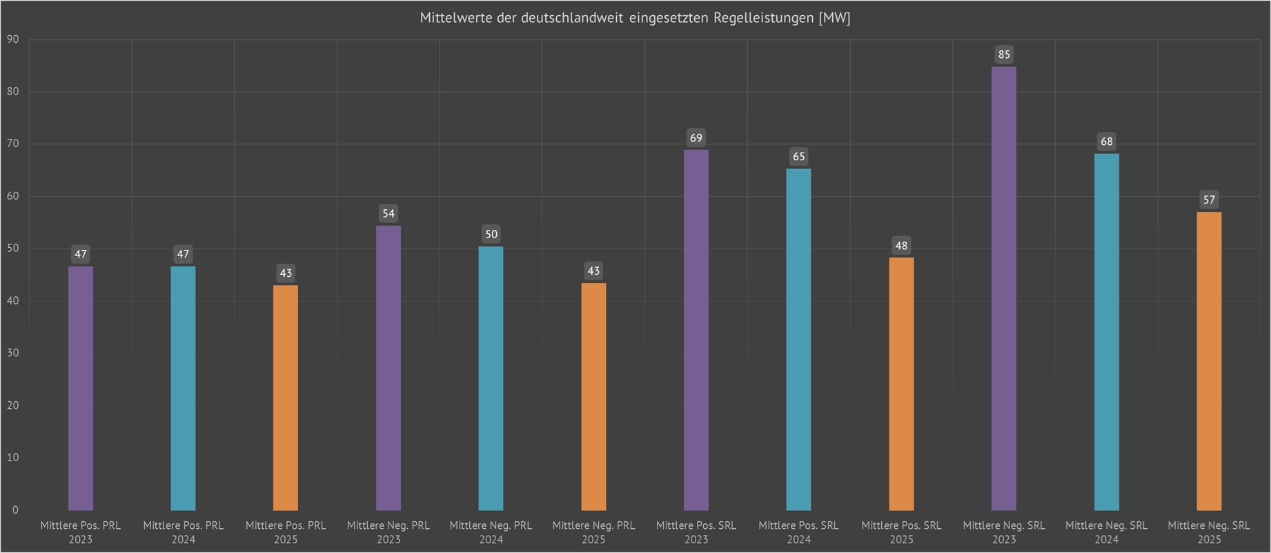 | Dargestellt sind die über das jeweilige Jahr gemittelte eingesetzte positive und negative Primär- und Sekundärregelleistung der Übertragungsnetzbetreiber für das gesamte deutsche Netzgebiet. Weiterhin sind die jeweiligen maximal eingesetzten Leistungen dargestellt. | ||||||||||||||||||||||||