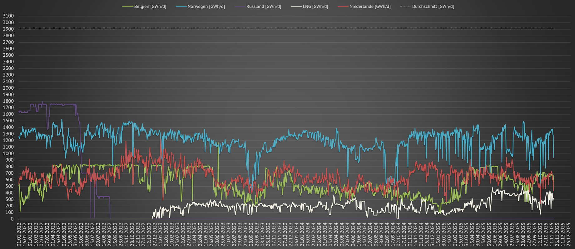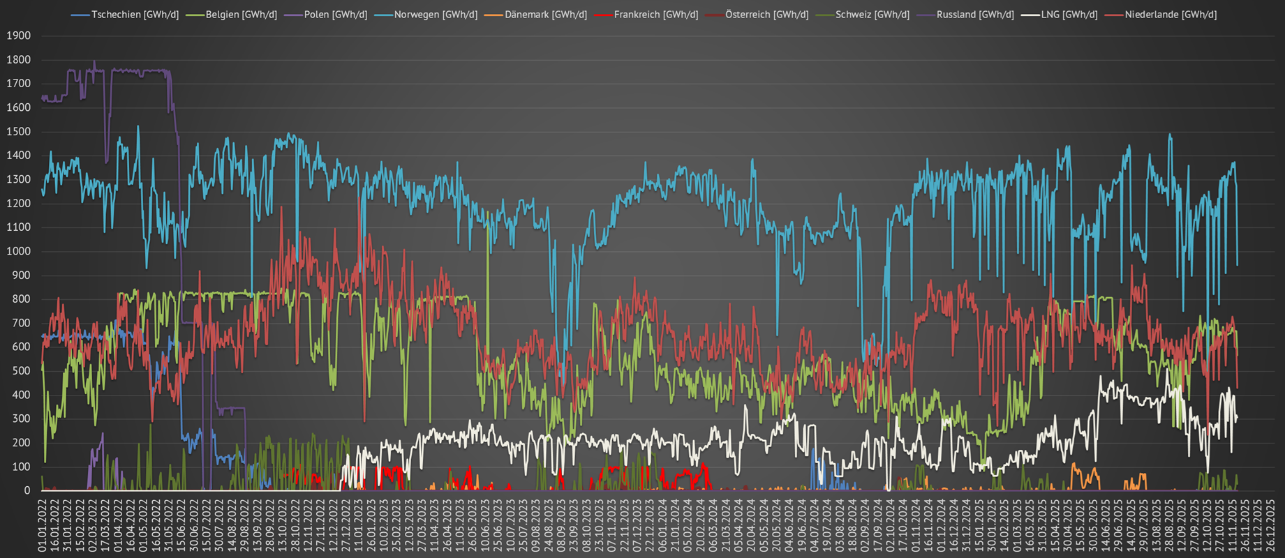 | Dargestellt sind die länderspezifischen Pipline-Gasimporte Deutschlands in Gigawattstunden pro Tag. | |||||||