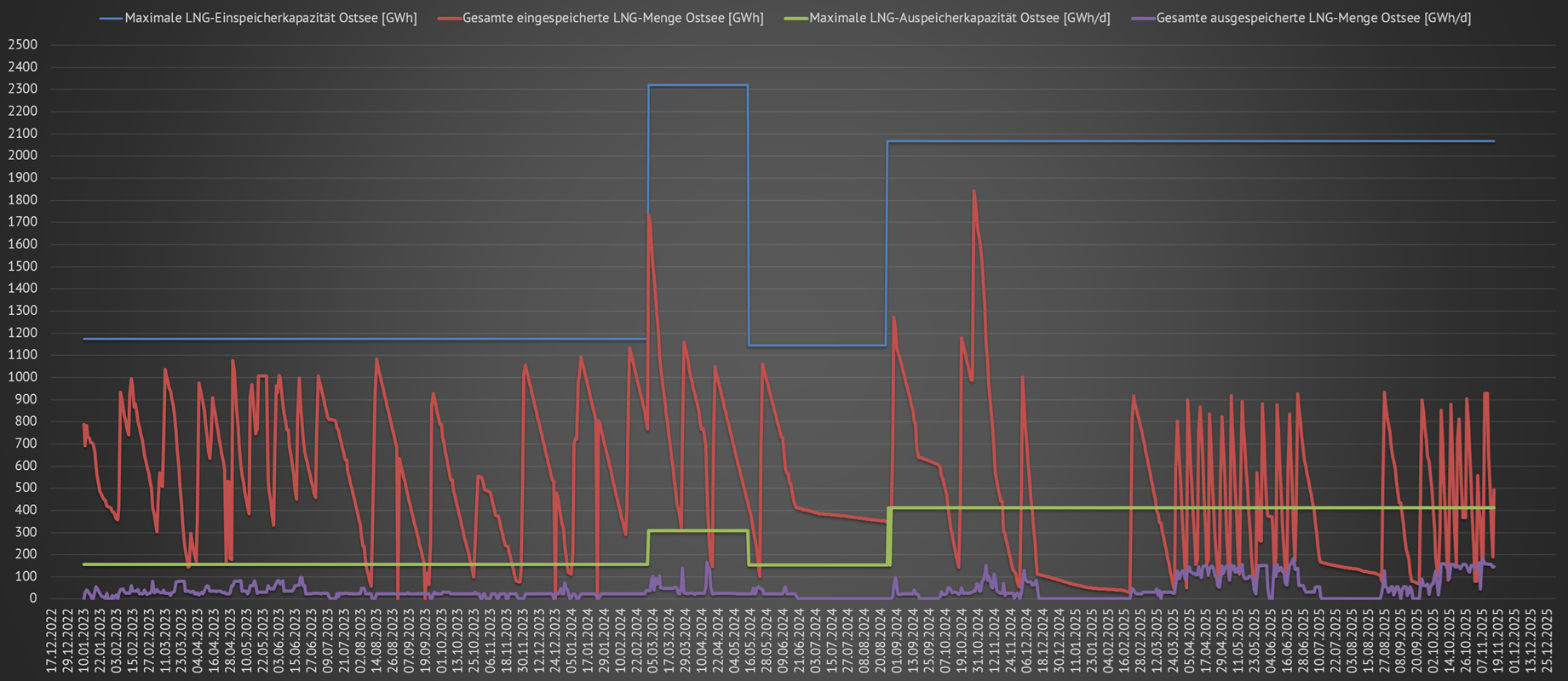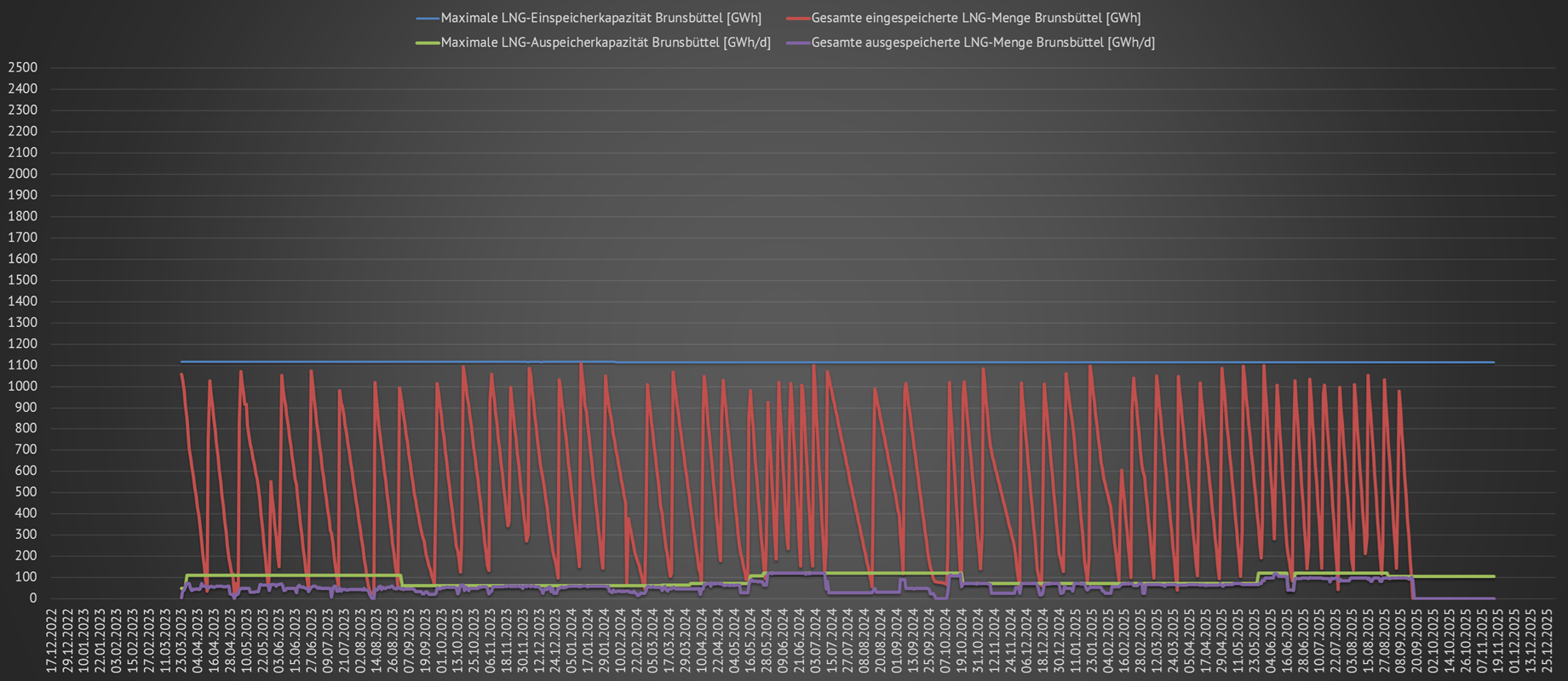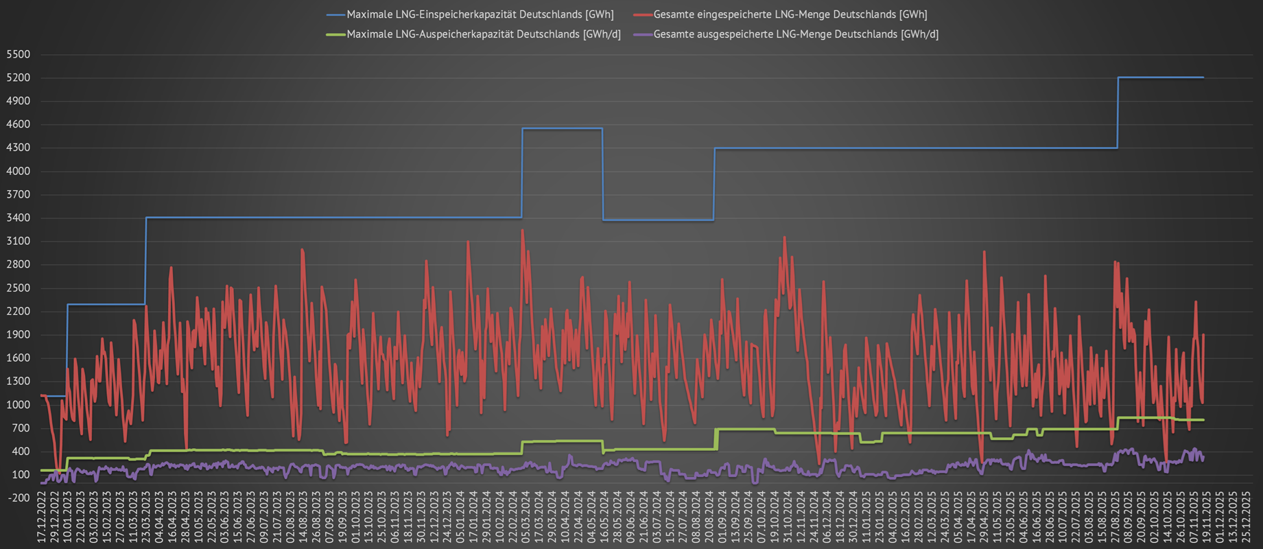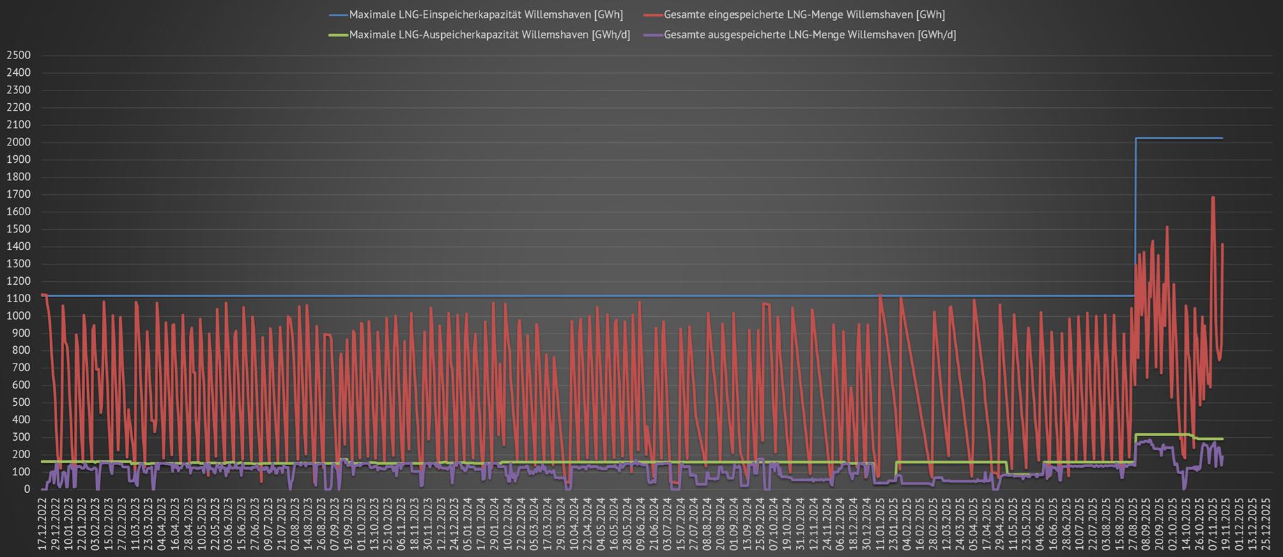 | Dargestellt sind die täglichen LNG-Importmengen Deutschlands in Gigawattstunden pro Tag. | |||||||