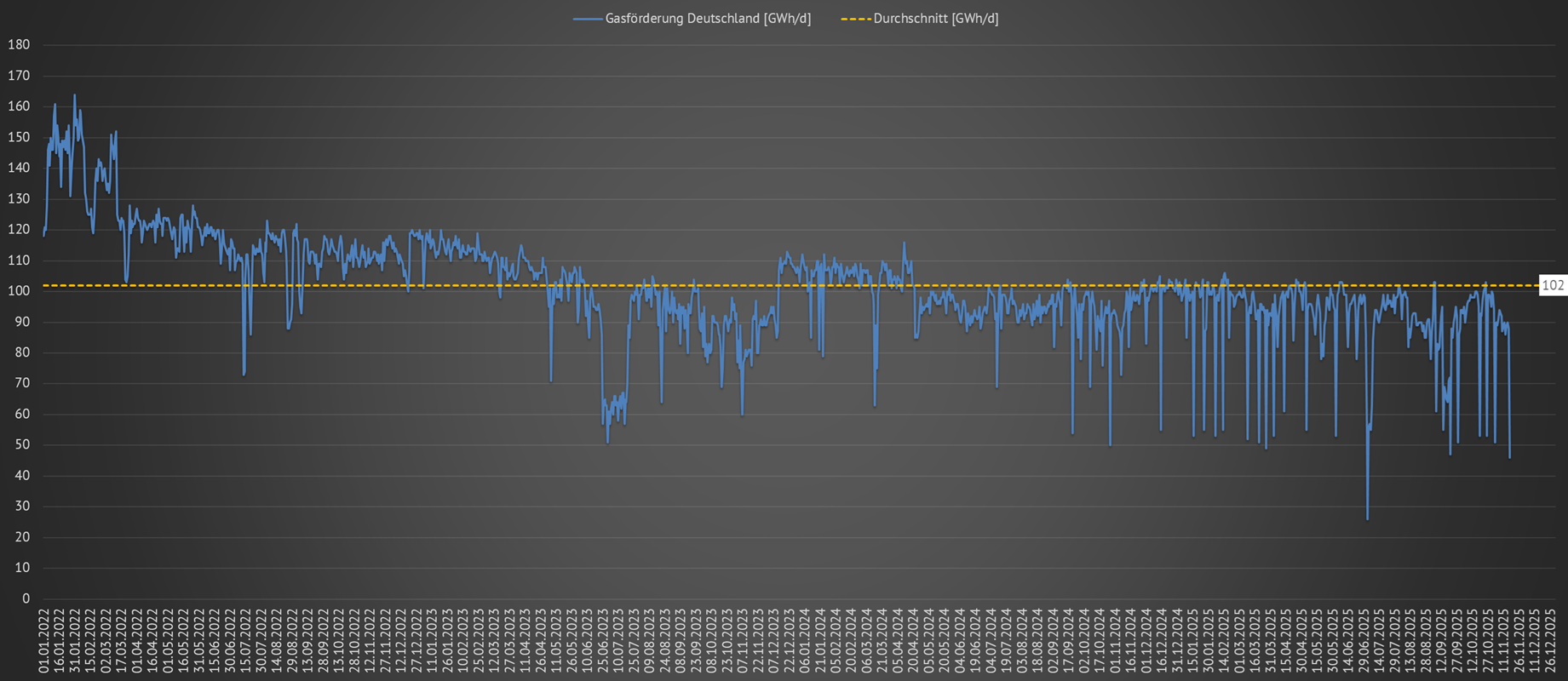 | Dargestellt sind die Erdgasförderungen Deutschlands in Gigawattstunden pro Tag. | |||||||