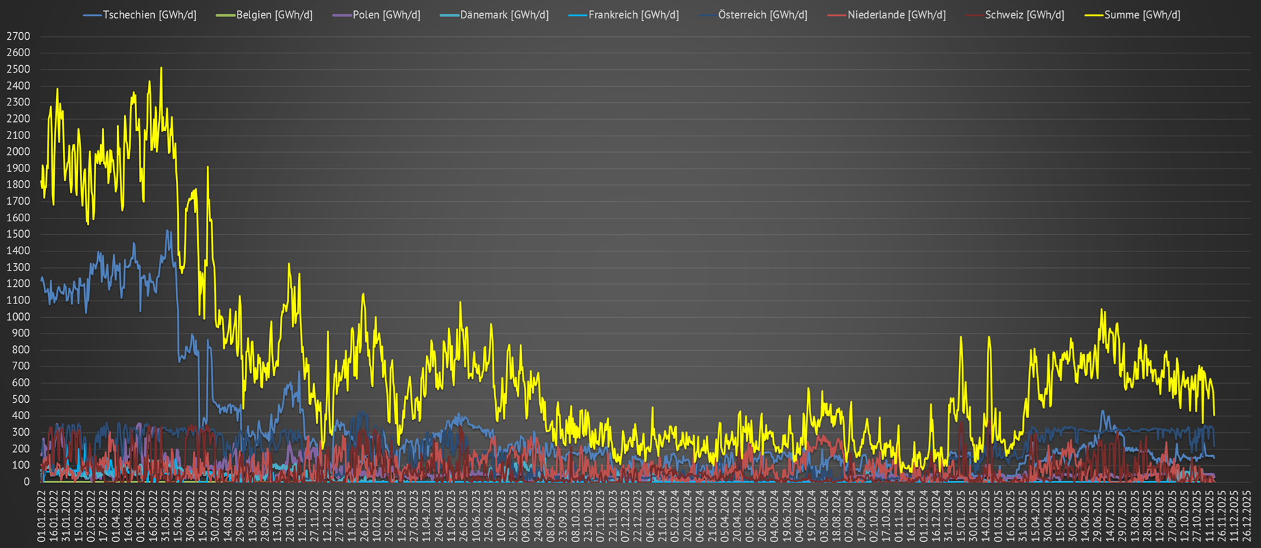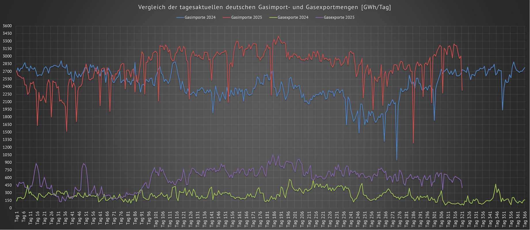 | Deutschland hatte seine Gasexporte in die Nachbarländer (hauptsächlich nach Tschechien) zwischen dem 26.05.2022 (2450 GWh) und dem 04.11.2024 (58 GWh) um mittlerweile 97,6 % reduziert. Hauptsächlich durch diese drastischen Exportreduzierungen konnten die deutschen Gasspeicher aufgefüllt werden. | |||||||