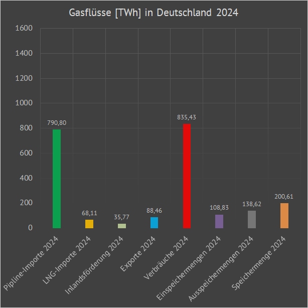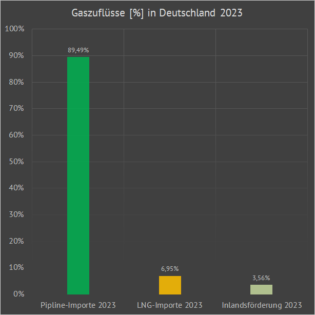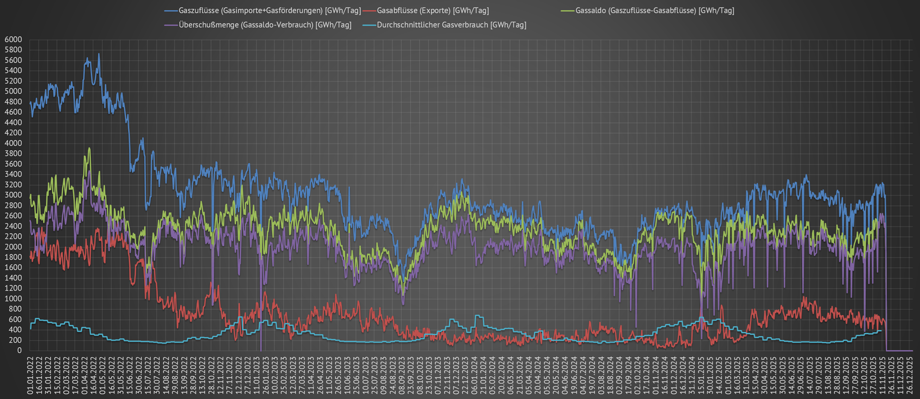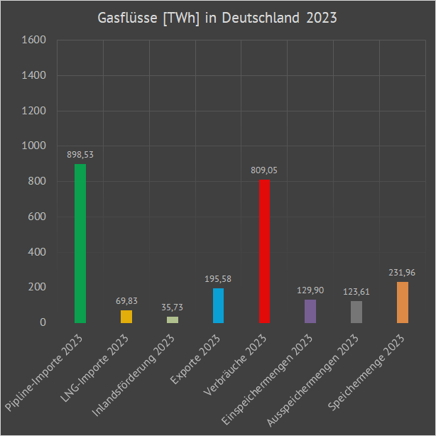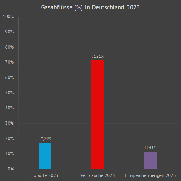 reduziertem LNG-Import und reduziertem Gasexport Täglicher Pipline-Gasimport: 2841 GWh Täglicher LNG-Gasimport: 40 GWh Tägliche Inlandsgasförderung: 104 GWh Täglicher Gasexport: 666 GWh Gasverbräuche: wie 2022 Gasspeichervermögen: 249,5261 TWh --> KEINE GASMANGELLAGE |