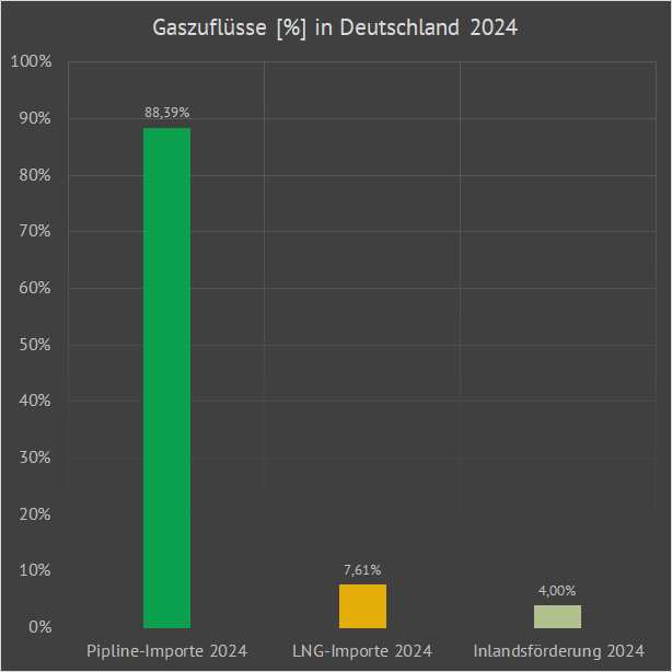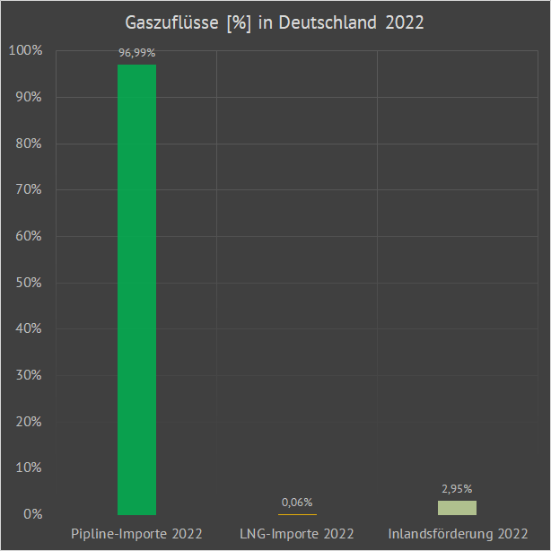 | Dargestellt sind die Anteile der relevanten Gasmengen der deutschen Gasversorgung in den ausgewählten Jahren. Es ist ersichtlich, dass der Anteil der sehr umweltschädlichen LNG-Mengen so gering ist, dass diese Mengen leicht durch entsprechend gekürzte Exportmengen bzw. durch eine verdoppelte Ausweitung der Inlandsförderung ausgesteuert werden könnten. | |||||||