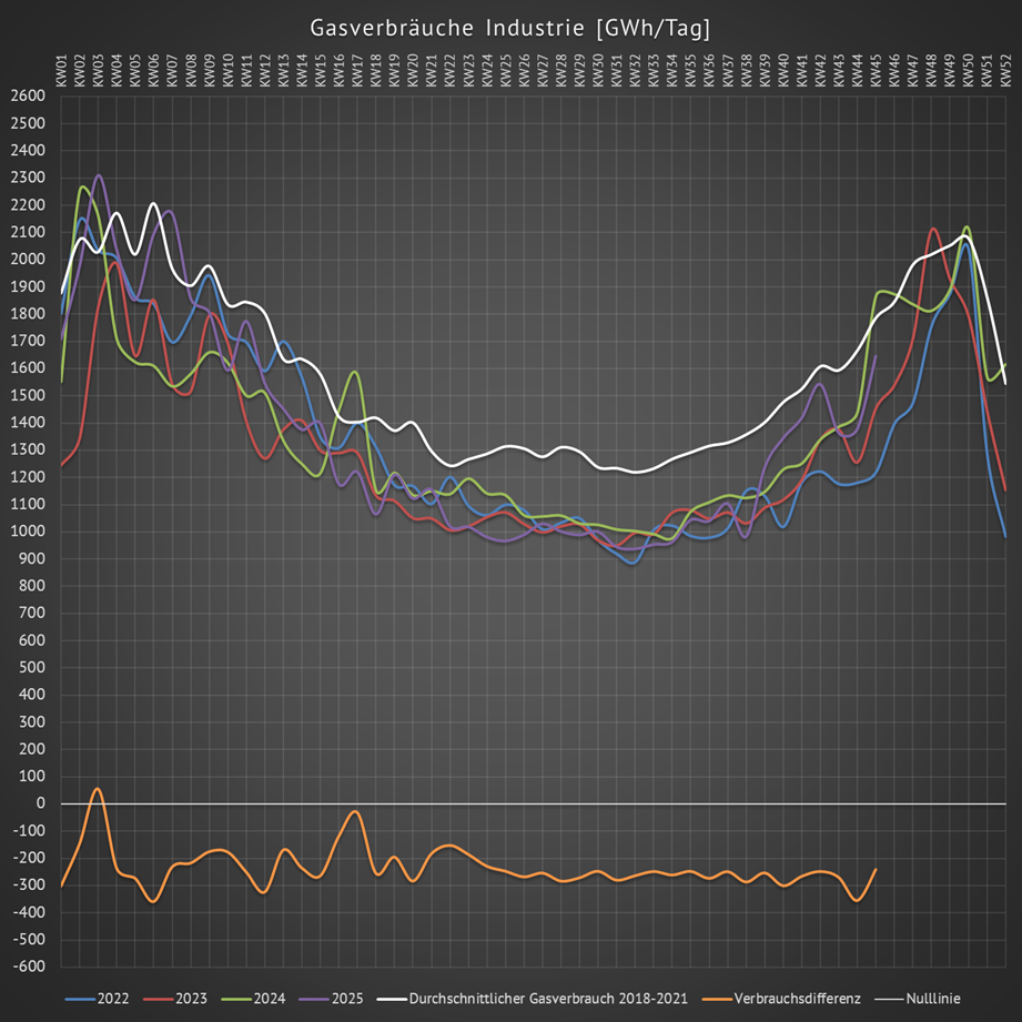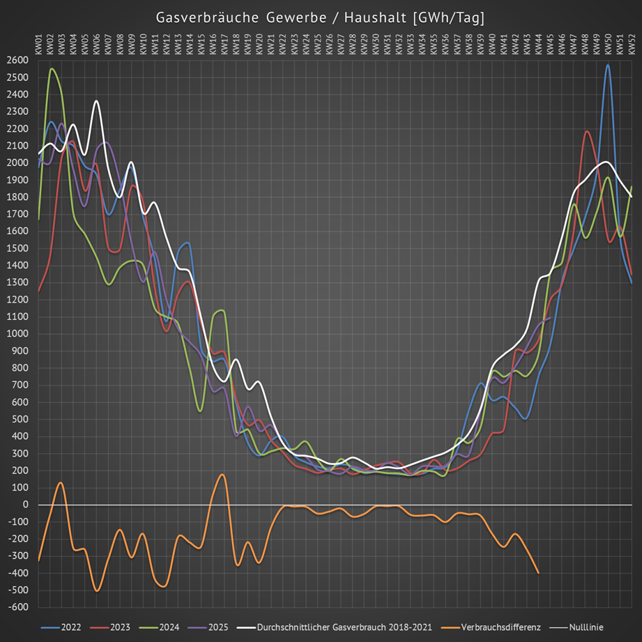 Dargestellt sind die deutschen Gasverbräuche für das vergangene und das aktuelle Jahr in GWh pro Tag. Die angezeigte Verbrauchsdifferenz ist der Unterschied zwischen dem durchschnittlichen Gasverbrauch 2018-2021 und den gemittelten Werten der Jahre 2022 bis 2025. Negative Werte bedeuten einen Minderverbrauch, positive Werte hingegen bedeuten einen Mehrverbrauch an Gas in der entsprechenden Kalernderwoche. Es ist deutlich zu erkennen, dass sowohl die Industrie als auch die privaten Haushalte und das Gewerbe seit 2022 weniger verbrauchen als im Mittel der Jahre 2018 bis 2021. |
