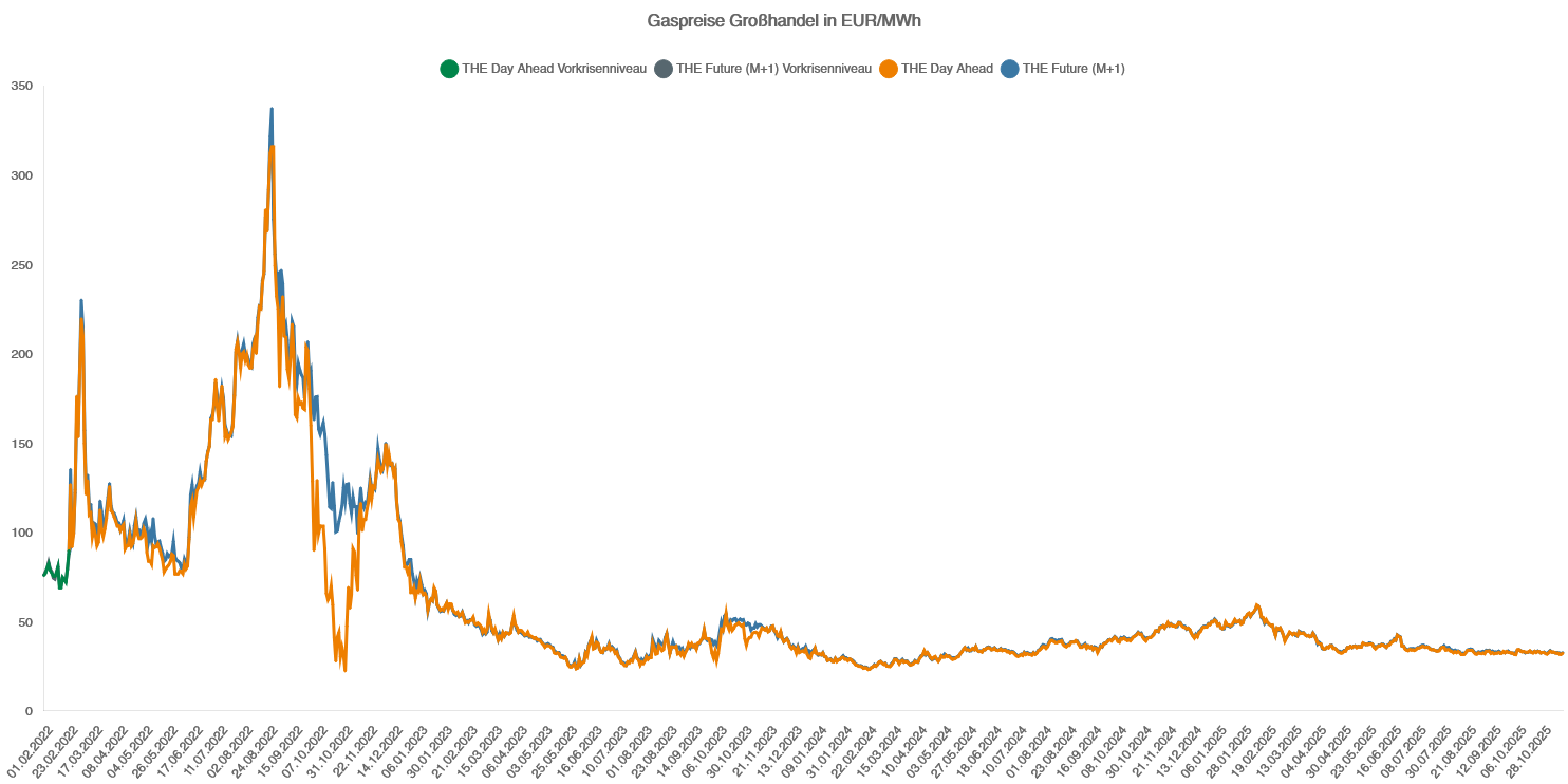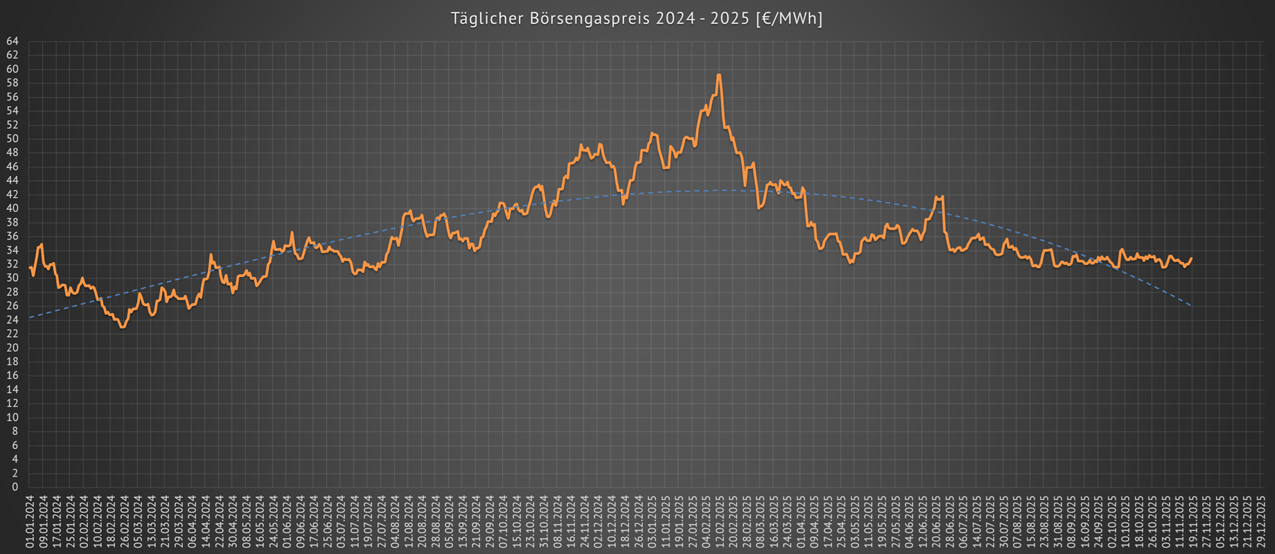 | Dargestellt sind die deutschen Großhandelspreise für Gas in €/MWh. | |||||||