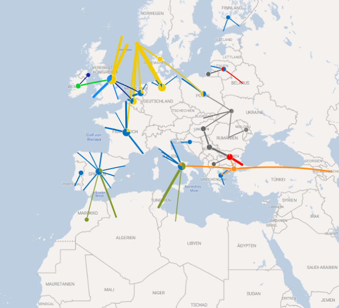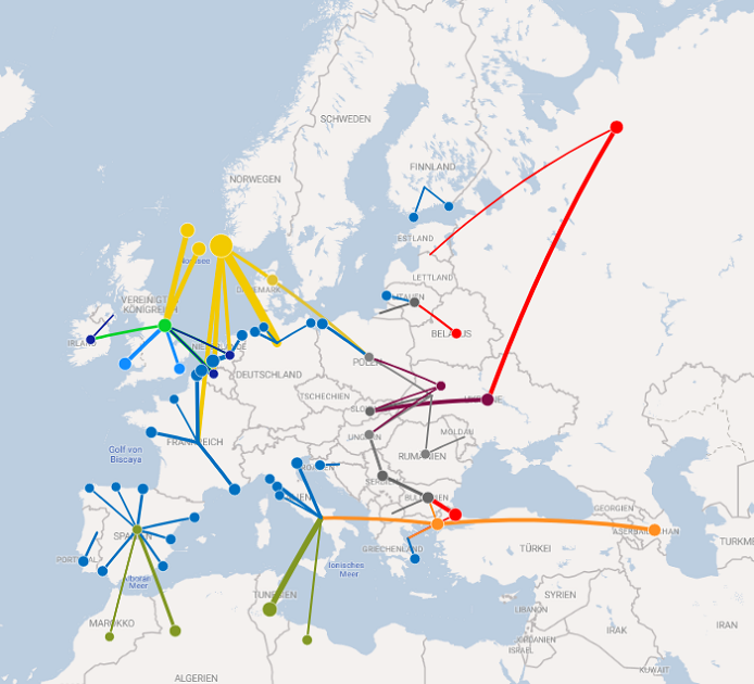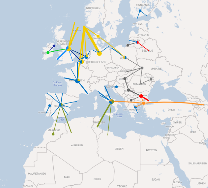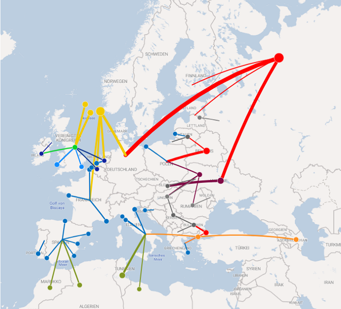 | Dargestellt sind die Gasflüsse innerhalb und nach Europa in den Jahren 2021 - 2025. | |||||||