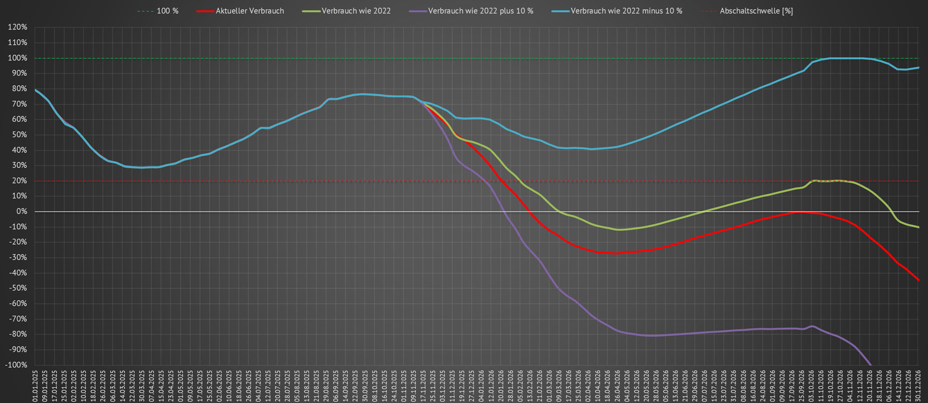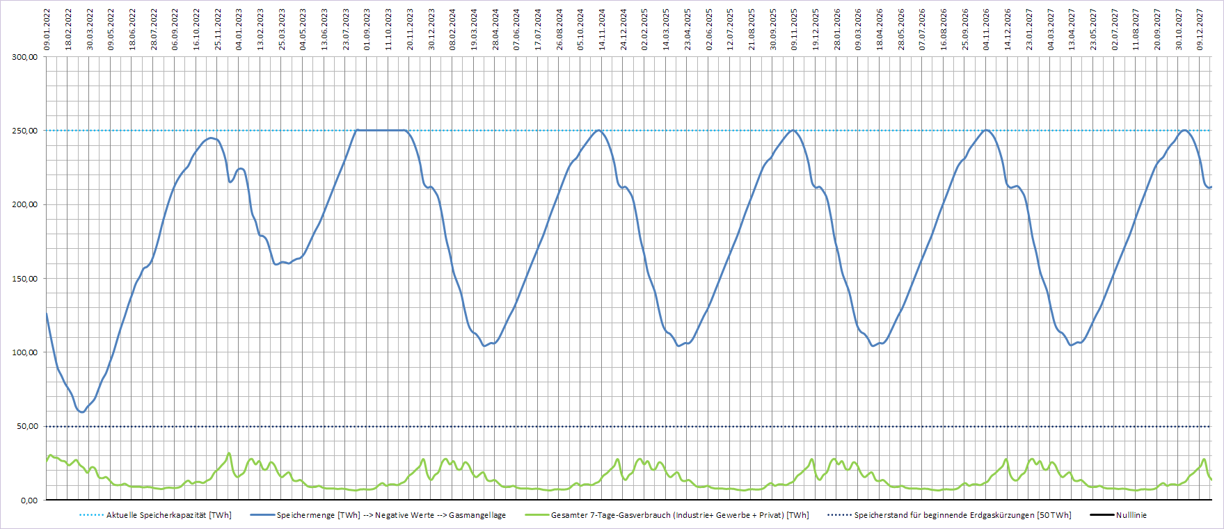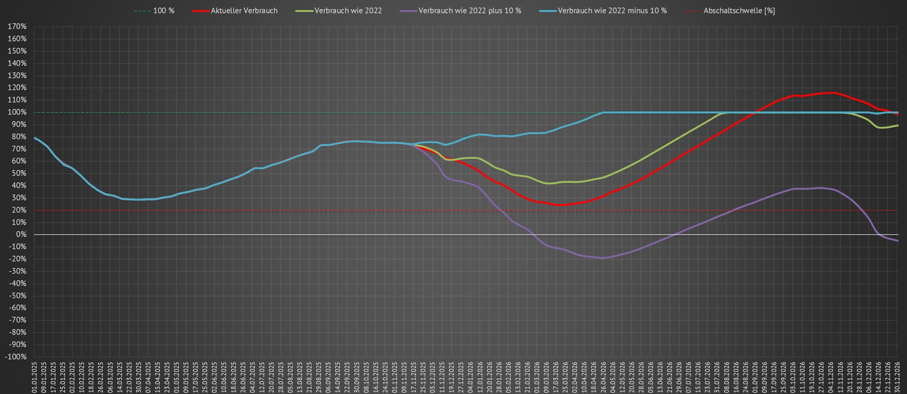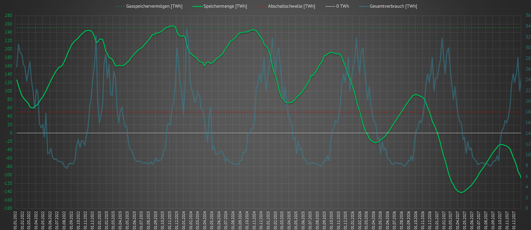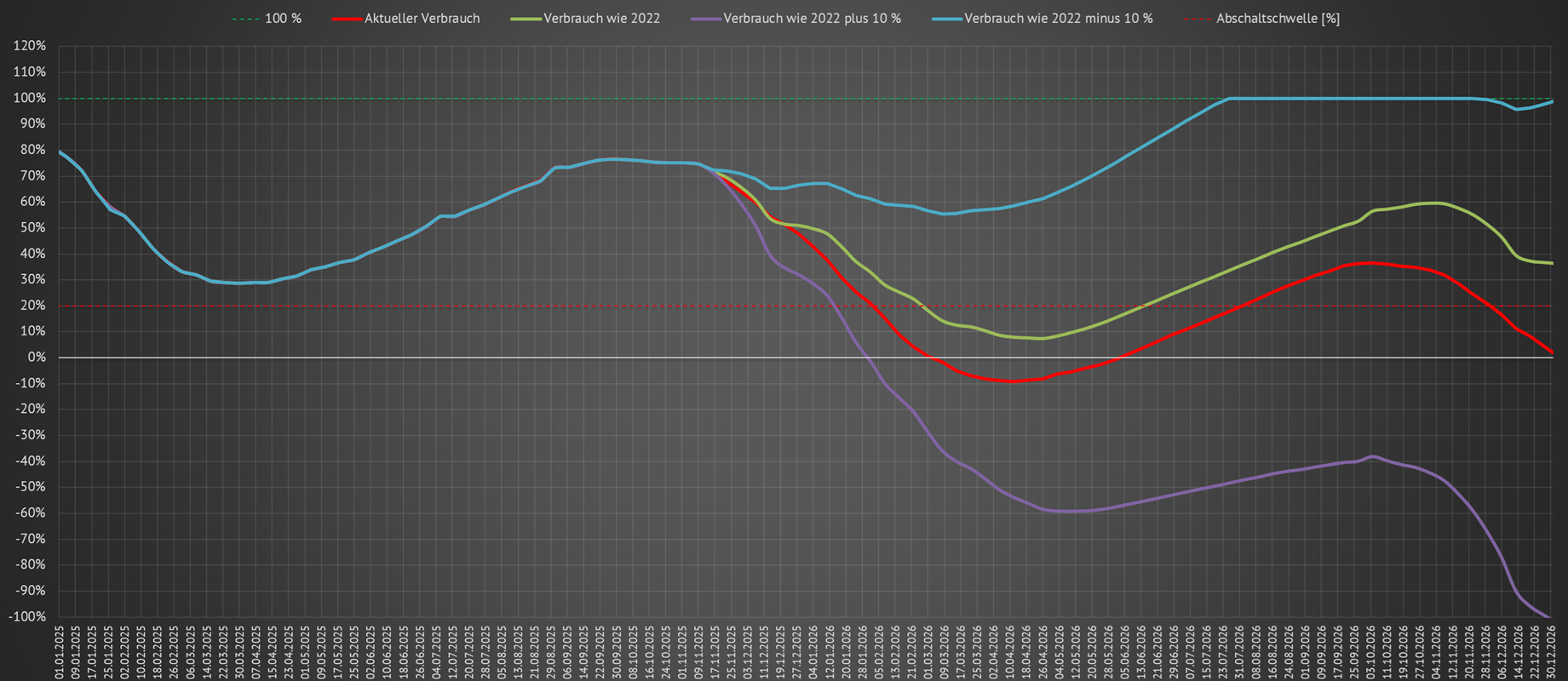 | Verlauf der prognostizierten Gasspeichermenge --> Gasmangellage ab Januar 2026 | |||||||