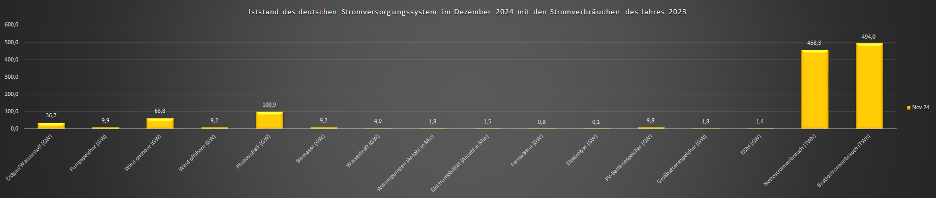| Die nachfolgende Grafik zeigt den Iststand der deutschen Stromversorgung im November 2024 an. Die Netto- und Bruttostromverbräuche geben die Werte des Jahres 2023 wieder: |