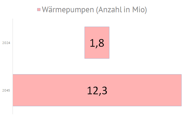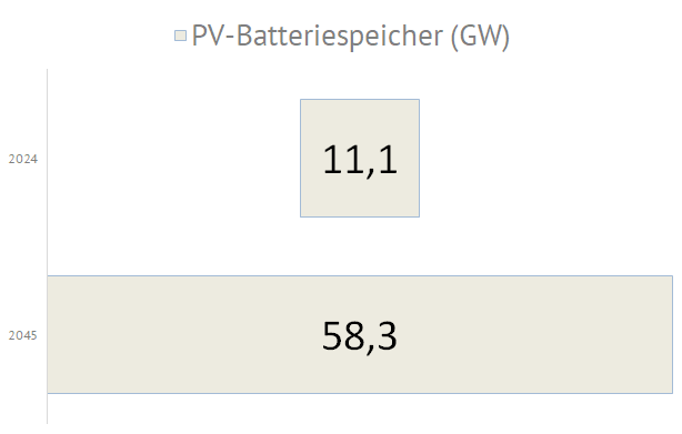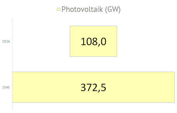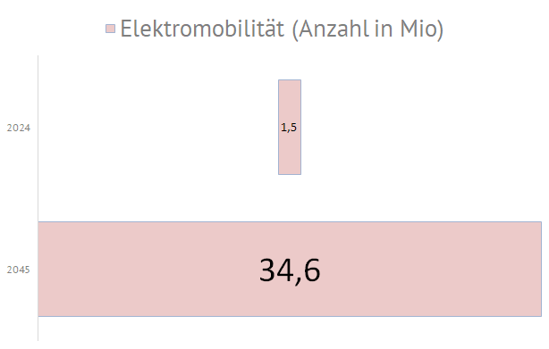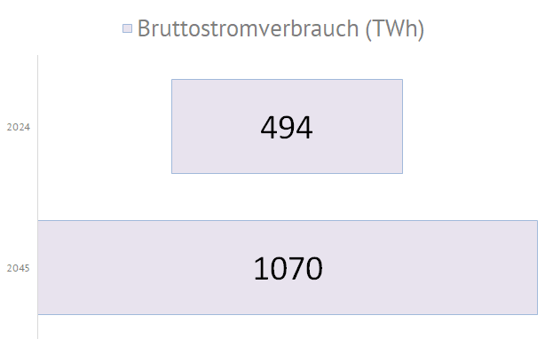 | Die nachfolgende Grafiken zeigen die geplanten Zubauwerte der zukünftigen deutschen Stromversorgung an. Die im September 2024 in Deutschland installierte Elektrolyseurleistung von ca. 0,1 GW soll dann, entsprechend des Szenarios C 2045, bis zum Jahr 2045 um eine Leistung von 80 GW erhöht werden. Die Photovoltaikkraftwerke müssen dann mit einer zusätzlichen Leistung von 408 GW auf 500 GW ausgebaut werden. Die Anzahl der E-Autos soll sich dann von derzeit 1,5 Mio. Fahrzeuge um 43 Mio. Fahrzeuge auf 45 Mio. Elektrofahrzeuge erhöhen. Der Bruttostromverbrauch steigert sich von 494 TWh im Jahr 2023 bis zum Jahr 2045 um 857 TWh auf dann 1351 TWh: |