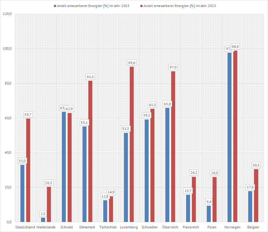 | Im Jahr 2015 betrug der Anteil der erneuerbaren Energien an der europäischen Stromproduktion im Schnitt 40,3 %. Dieser Anteil steigerte sich in 8 Jahren auf 55,2 %. Das entspricht einer Steigerung um 37 %. | ||||||||||||
