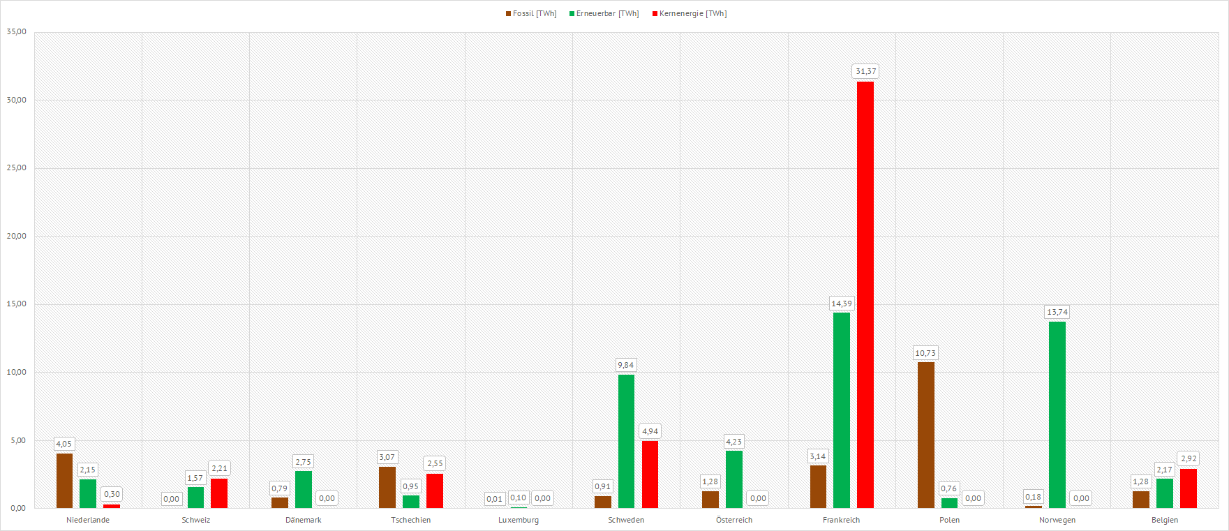 Länderspezifisch exportierte und importierte Strommengen aus und nach