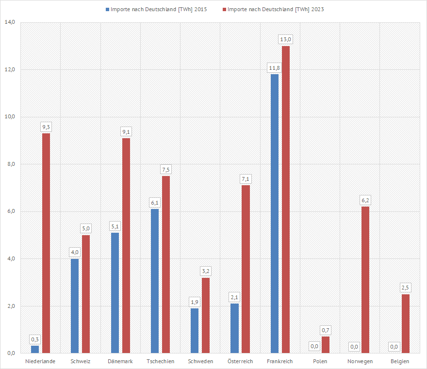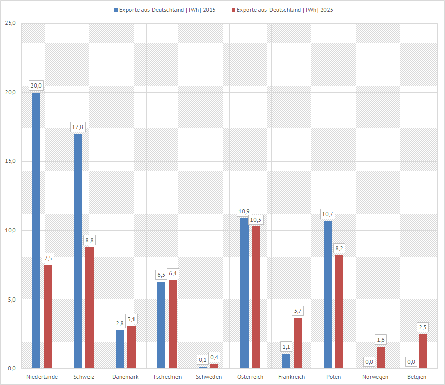 | 2015 exportierte Deutschland 20000 GWh in die Niederlande. Im selben Jahr importierte Deutschland 11800 GWh aus Frankreich. 2023 exportierte Deutschland 7500 GWh in die Niederlande. Im selben Jahr importierte Deutschland 13000 GWh aus Frankreich. | ||||||||||||