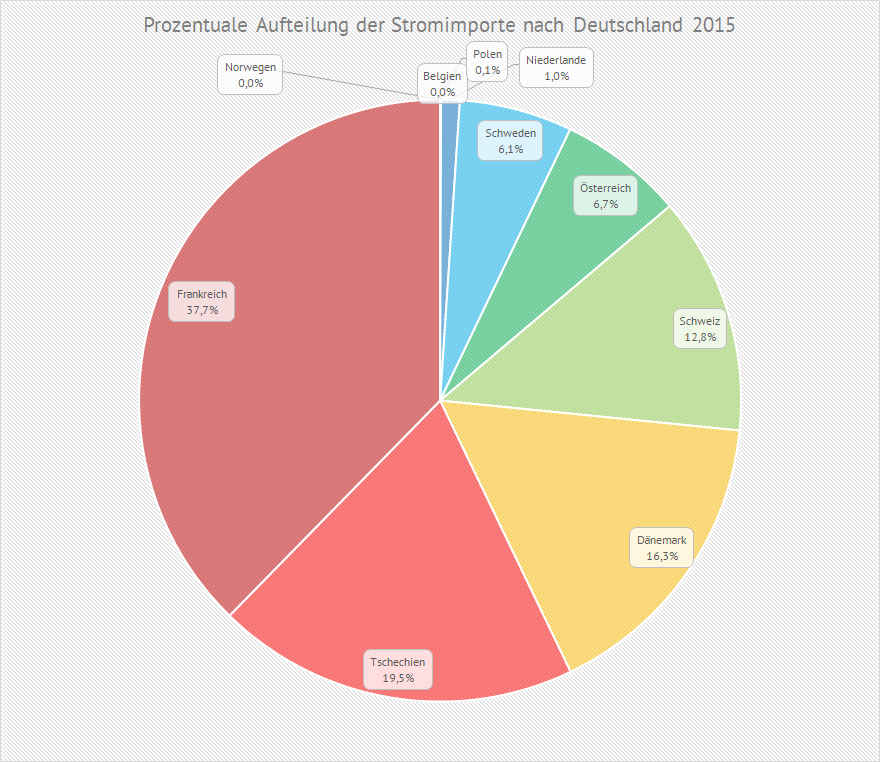 | Im Jahr 2015 importierte Deutschland 37,7 % seiner gesamten Importenergiemenge aus Frankreich. Damit war im Jahr 2015 Frankreich der größte Stromlieferant für Deutschland. | ||||||||||||