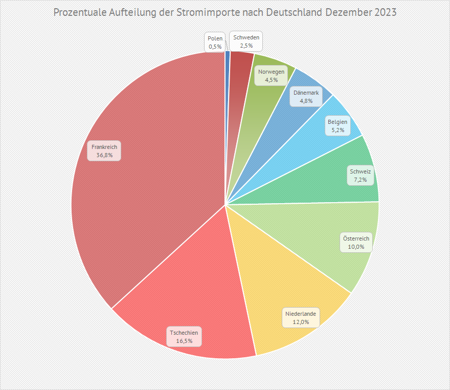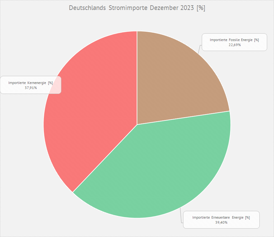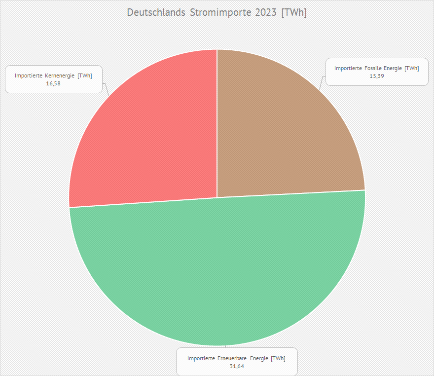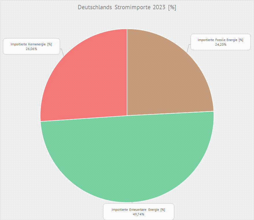 | Seit Mai 2023 hat sich Frankreich zum größten Stromlieferanten für Deutschland entwickelt. Dabei beträgt im aktuellen Monat der Kernenergieanteil im importierten französischen Strommix 64,15 %. Hingegen beträgt der Anteil erneuerbarer Energien im aktuell importierten dänischen Strommix 77,81 %. | ||||||||||||