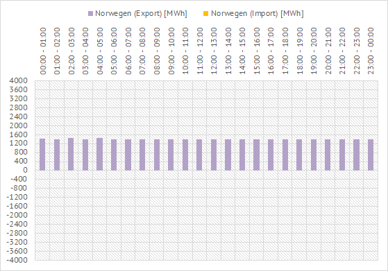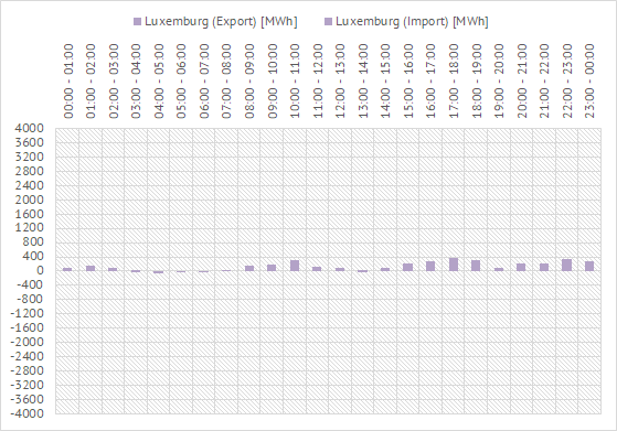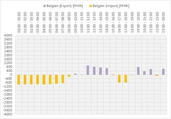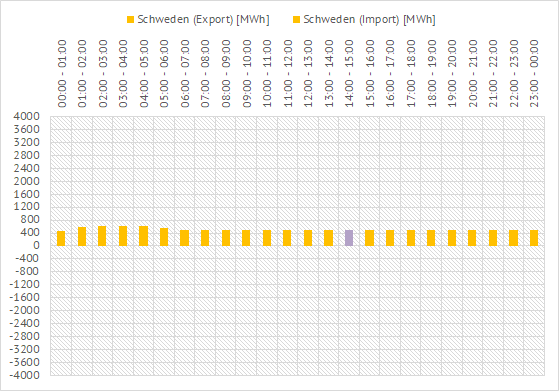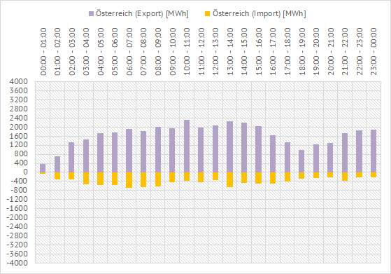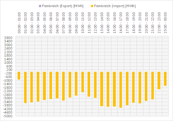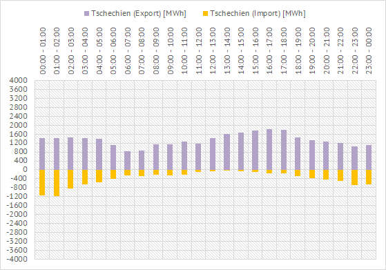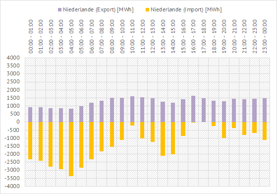 | Dargestellt sind die über eine Zeitstunde aufsummierten viertelstündlichen positiven und negativen Energieflüsse [MWh]. Gelbe Balken bedeuten Import, lila Balken bedeuten Export von Elektroenergie aus dem und in das dargestellte Nachbarland zwischen den jeweiligen Tagesstunden. | ||||||||||||