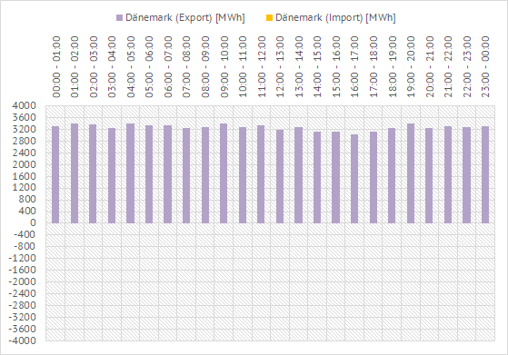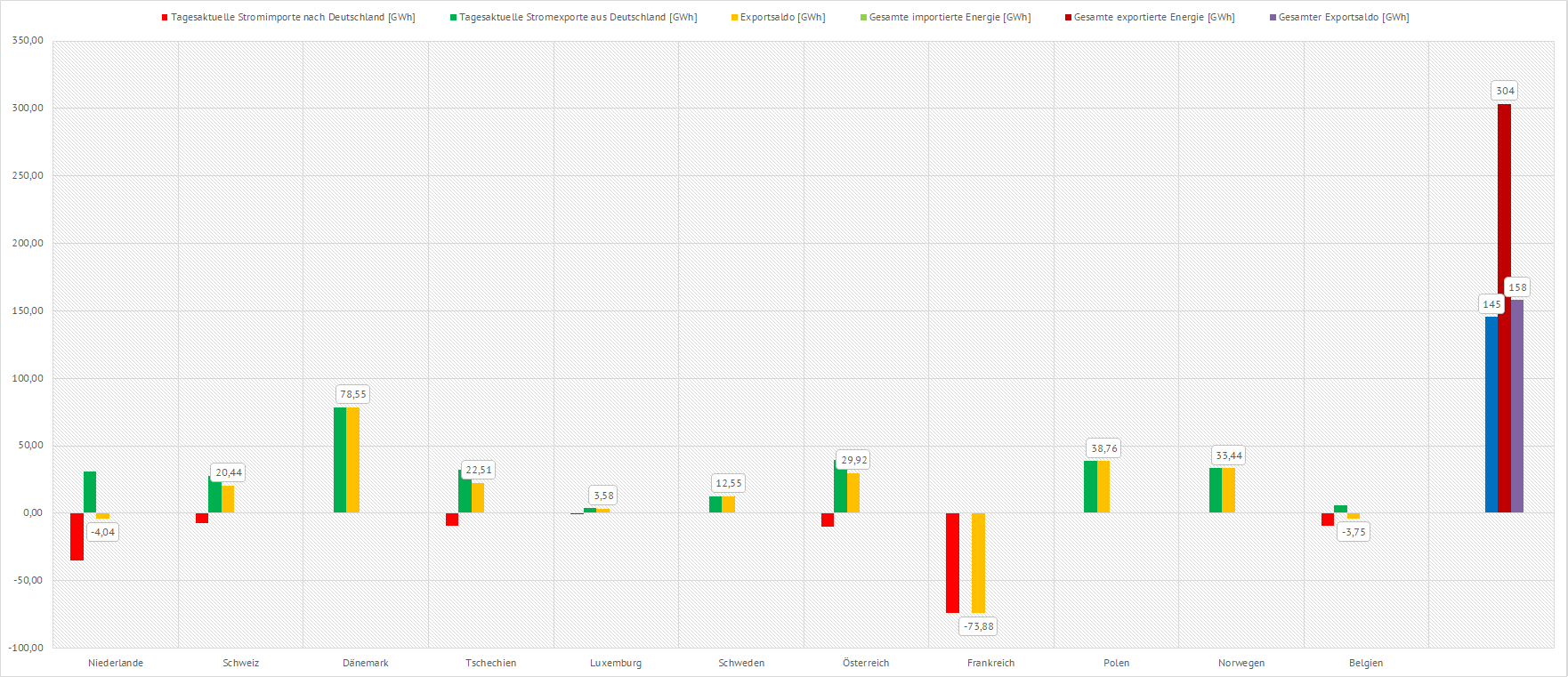| Angezeigt werden die länderscharfen exportierten und importierten Strommengen [GWh] in das Ausland und aus dem Ausland über den gesamten Tag. Des Weiteren werden die tagesscharfen gesamten Export- und Importenergiemengen sowie der Exportsaldo in GWh angezeigt. Ein negativer Exportsaldo bedeutet Import von Elektroenergie. | ||||||||||||