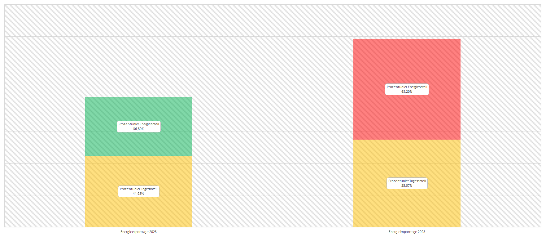 Prozentuale Aufteilung der Stromexport- und der Stromimporttage sowie die prozentuale Aufteilung der beteiligten Energiemenge der bisherigen Tage im Jahr 2023 |