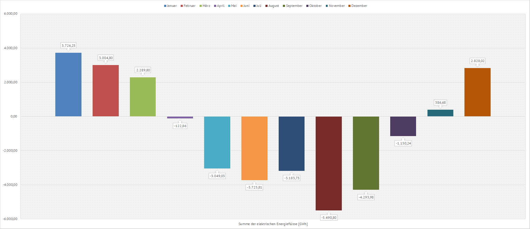 Monatliche elektrische physikalische Energieflüsse [GWh] aus und nach