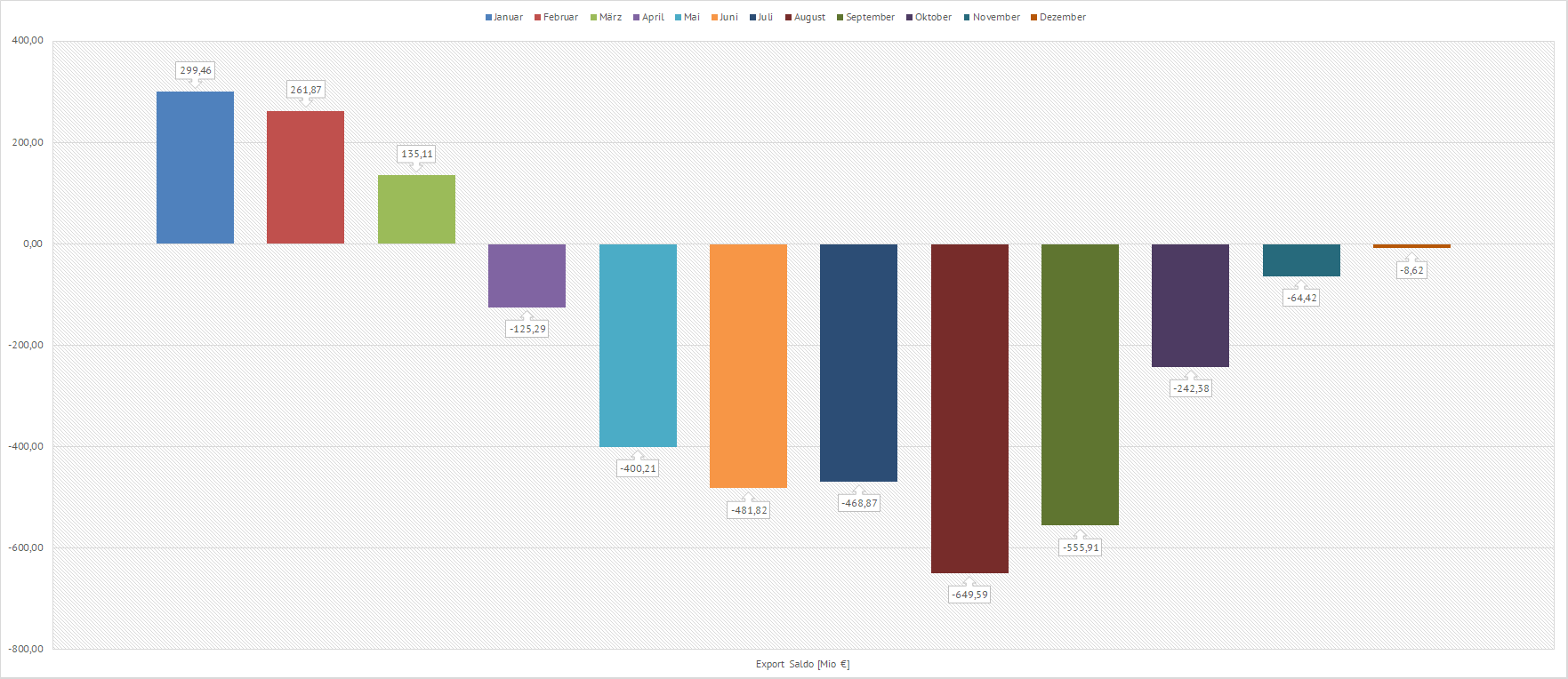 | Im Januar erzielte Deutschland aus seinen Stromexporten einen Betrag von 299,46 Millionen € (Exporterlöse von 700,84 Mio € minus Importzahlungen von 401,38 Mio €) . Im August zahlte Deutschland infolge der Stromimporte unterm Strich eine Rekordsumme von 649,59 Millionen € an die ausländischen Lieferanten. Deutschland nahm durch seine Stromexporte im August 97,50 Millionen € ein, zahlte aber gleichzeitig 747,10 Millionen € für den Import von Strom. | ||||||||||||