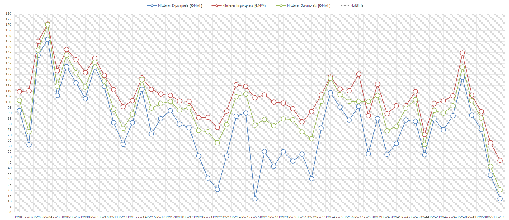 | In der Kalenderwoche 4 (KW4) erzielte eine aus Deutschland exportierte Megawattstunde (MWh) einen mittleren Preis von 156,99 €. In derselben Kalenderwoche mußte Deutschland für eine importierte Megawattstunde im Mittel 170,76 € bezahlen. Der mittlere börsliche Kundenstrompreis betrug dabei 170,27 €. | ||||||||||||