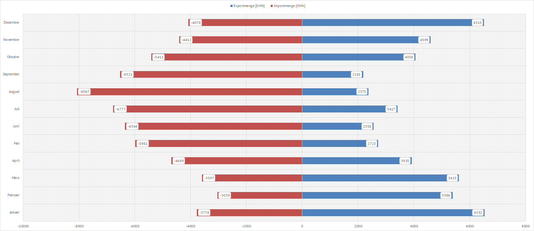 | Angezeigt werden die monatlich exportierten und importierten physikalischen Strommengen [GWh] in das Ausland und aus dem Ausland für das aktuelle Jahr. Positive Energiemengen bedeuten Export (Strom fließt in das Ausland), negative Energiemengen bedeuten Import (Strom fließt nach Deutschland). So importierte Deutschland im Juli 2023 6,777 TWh aus dem Ausland und exportierte im selben Monat eine Energiemenge von 3,417 TWh in das Ausland. | ||||||||||||