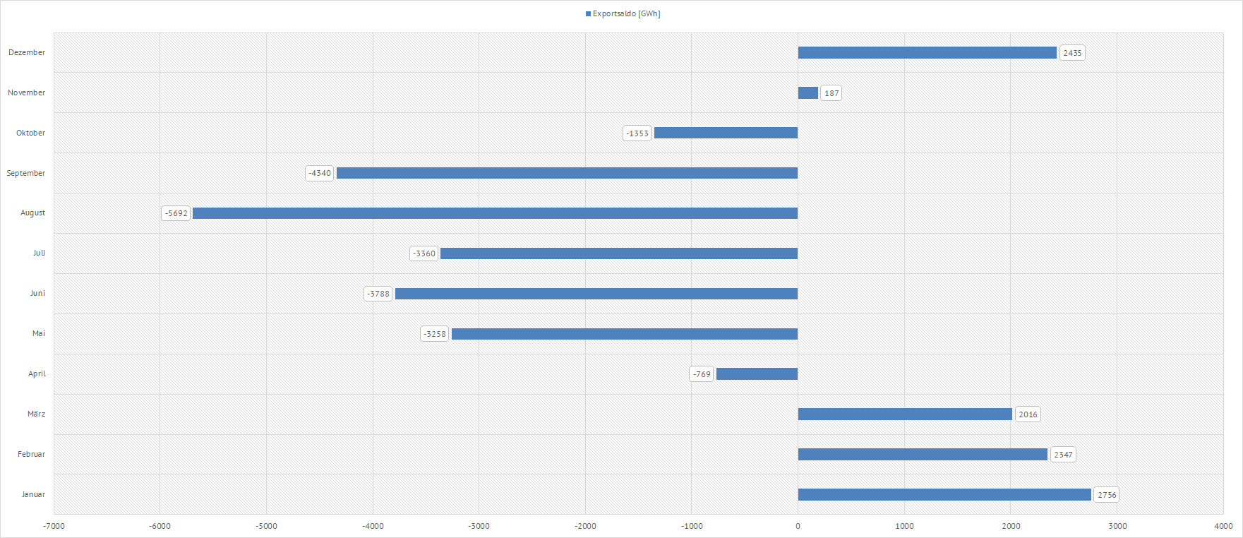 | Angezeigt werden die monatlichen Exportsalden Deutschlands bzgl. der in der oberen Grafik aufgeführten Nachbarnländer. Im Januar 2023 betrug das Exportsaldo (Differenz aus Export und Import) 2756 GWh. Das heißt, Deutschland hat im Januar unterm Strich also 2756 GWh mehr exportiert als importiert. Deutschland war Nettoexporteur. Im Juni 2023 betrug der Exportsaldo -3788 GWh. Das bedeutet, dass Deutschland im Juni 3788 GWh mehr importiert als exportiert hat. Deutschland war Nettoimporteur. | ||||||||||||