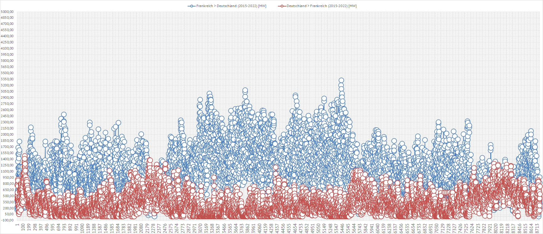 | Dargestellt sind die über eine Zeitstunde gemittelten Leistungsflüsse zwischen Deutschland und Frankreich in den Jahren 2015 bis einschließlich 2022. Es ist deutlich erkennbar, dass in den Sommermonaten die Stromimporte aus Frankreich am größten sind, diese aber (auf Grund des Eigenverbrauchs Frankreichs durch elektrische Heizungen) in der kalten Jahreszeit deutlich reduziert sind. Frankreich kann in den kälteren Wochen also nur noch einen Teil der Strommengen nach Deutschland exportieren, wie sie in den warmen Jahreswochen üblich sind. Das könnte in den kälteren Jahreszeiten für Deutschland (durch den Wegfall der atomaren Grundlastkraftwerke) zu einem nicht zu vernachlässigbaren Problem werden, weil in diesen Zeiten die Energieerzeugung durch die deutschen Solarkraftwerke naturgemäß vernachlässigbar ist. | ||||||||||||
