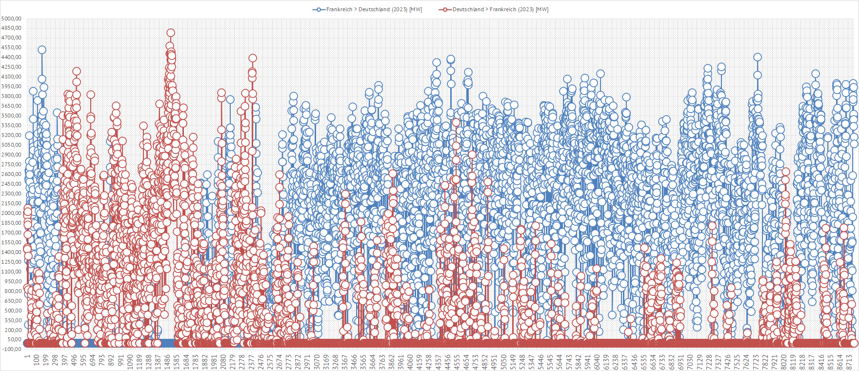 | Dargestellt sind die über eine Zeitstunde gemittelten Leistungsflüsse zwischen Deutschland und Frankreich 2023. Es ist deutlich die Abnahme der Stromexporte nach Frankreich und die Zunahme der Stromimporte aus Frankreich ab der Jahresstunde 2700 (ca. Ende April) zu erkennen. | ||||||||||||