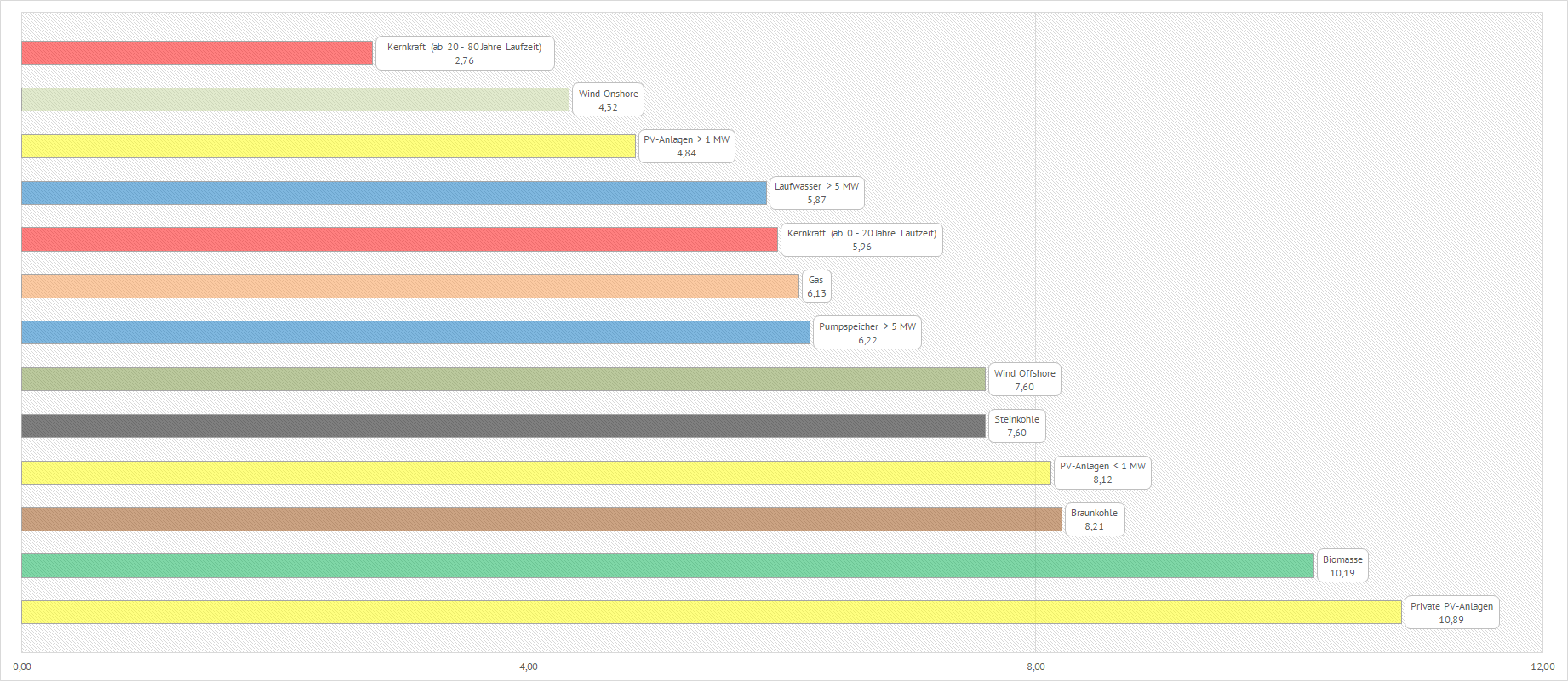| Laut der unteren Grafik hat ein Biomasse-Kraftwerk sehr hohe Stromgestehungskosten von 10,19 ct/kWh wohingegen ein abgeschriebenes Kernkraftwerk Stromgestehungskosten von lediglich 2,76 ct/kWh verursacht. | ||||||||||||||||||||||||||||||||||||||||||||||||||||||||||||||||||||