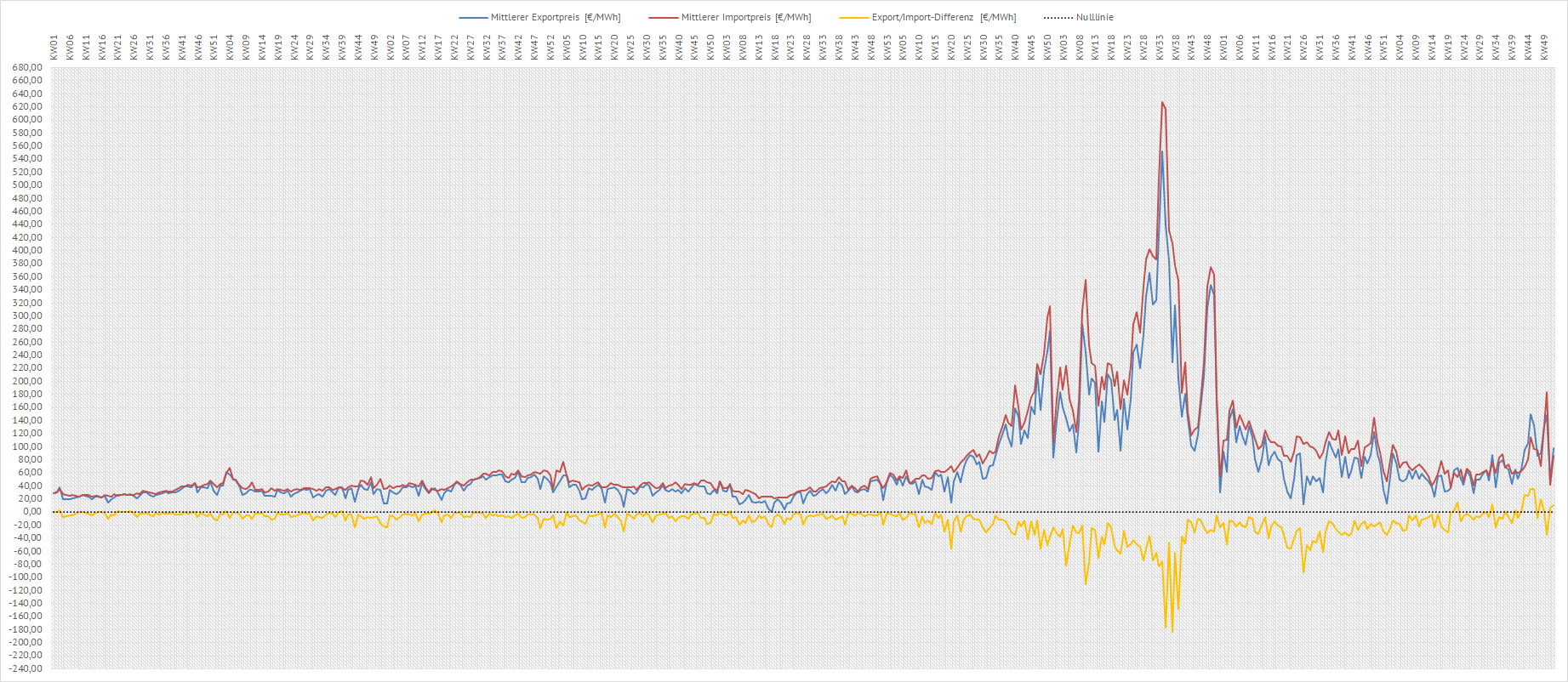 2022 bei 627,28 €. Das entpricht einem Kilowattstundenpreis von 62,728 ct. Die gelbe Linie zeigt den Differenzpreis zwischen dem erzielten Exportpreis und dem gezahlten Importpreis an. Eine hohe negative Differenz bedeutet, dass Deutschland in dieser Kalenderwoche für seine Stromexporte nur geringe Erlöse erzielt hat, dafür aber gleichzeitig hohe Preise für seine Stromimporte zahlen mußte. Generell liegen die Exporterlöse stets unter den Importzahlungen. |