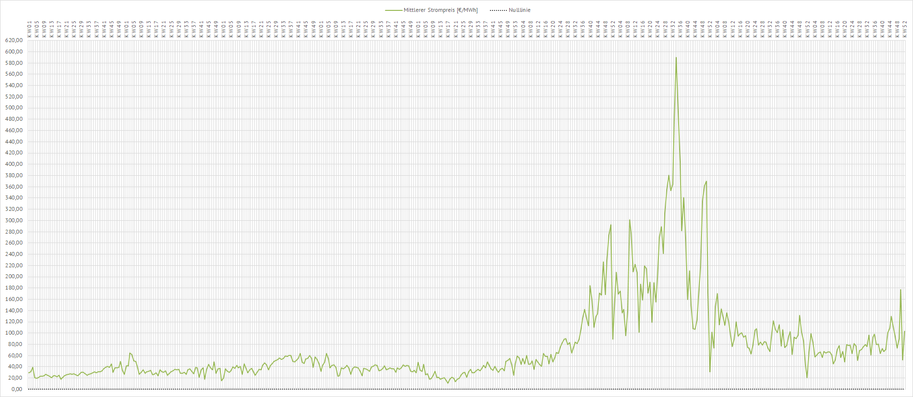 | Dargestellt ist die börsliche Preisentwicklung des über eine Kalenderwoche gemittelten Preises ausgehend von Kalenderwoche 01 (KW01) im Jahr 2016 bis zur aktuellen Kalenderwoche im Jahr 2023. | ||||||||||||||||||||||||||||||||||||||||||||||||||||||||||||||||||||