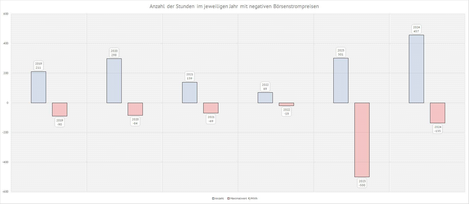 | Im Jahr 2023 wurden an 301 Stunden Börsenstrompreise mit negativen Werten gehandelt. Dabei betrug in diesem Jahr der gehandelte maximale negative Börsenstrompreis -500 € pro einer gehandelten Megawattstunde Strom. | ||||||||||||||||||||||||||||||||||||||||||||||||||||||||||||||||||||