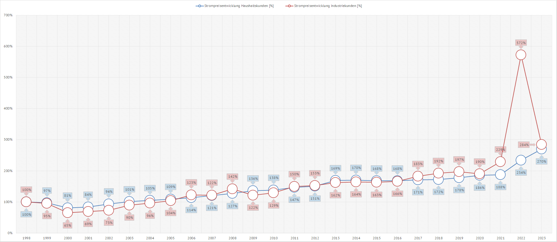 | Ausgehend vom Jahr 1998 erhöhte sich der Strompreis für die Haushaltskunden bis zum Jahr 2023 auf das 2,81-fache. Die Strompreise für die privaten Haushalte haben sich seit 1998 somit fast verdreifacht. Die Industriekunden mußten im Mittel im Januar 2023 einen vierfach höheren Strompreis zahlen als 1998. | ||||||||||||||||||||||||||||||||||||||||||||||||||||||||||||||||||||