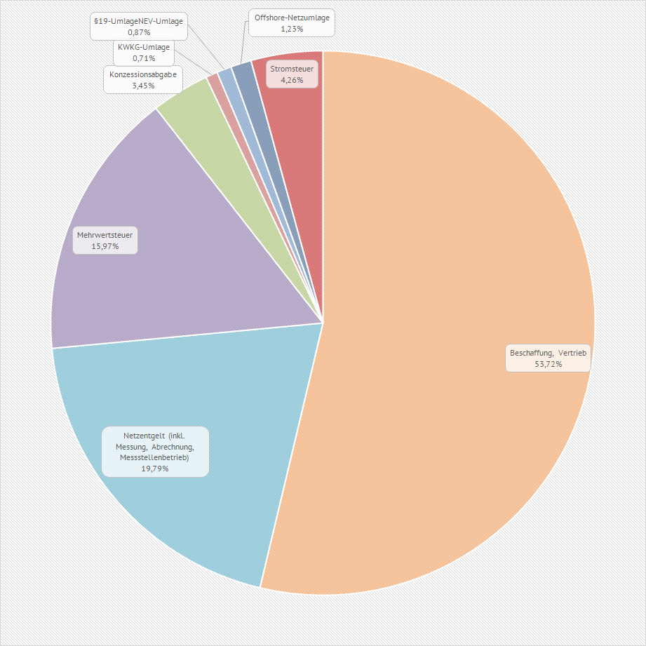 Komponenten zusammen: 1. Reiner Energiepreis plus ggf. Beschaffung, Marketing und Vertrieb 2. Netznutzungsentgelt ohne Messung und Messstellenbetrieb (6,45 ct/kWh Arbeitspreis im Höchstspannungsnetz) 3. Messung und Messstellenbetrieb (Moderne Messeinrichtung 20 €/Jahr, Intelligentes Messsystem verbrauchsabhängig 20 - 120 €/Jahr) 4. Konzessionsabgabe (1,32 ct/kWh bei Gemeinden bis 25000 Einwohner und bis zu 2,39 ct/kWh bei Gemeinden mit über 500000 Einwohner) 5. KWKG-Umlage (Kraft-Wärme-Kopplungsgesetz-Umlage 0,275 ct/kWh) 6. §19 StromNEV-Umlage (individuelle Netzentgeld 0,643 ct/kWh) 7. Offshore-Netzumlage (Kosten aus der Netzanbindung und Entschädigung von Offshore-Windparks 0,656 ct/kWh) 8. Stromsteuer (Förderung klimapolitischer Ziele durch einen sparsameren Umgang mit Elektrizität 2,05 ct/kWh) 9. Umsatzsteuer auf die Positionen 1 bis 7 (19 %) Die Positionen 3 - 9 sind staatlich veranlasste bzw. festgelegte Strompreisbestandteile und können nicht durch den Stromanbieter beeinflußt werden. Die Festlegung der Position 2 (Netznutzungsentgelte) geschieht in der Höhe durch die vier Übertragungsnetzbetreiber und sind durch die Bundesnetzagentur und unabhängige Wirtschaftsprüfer zu überprüfen. Die festgelegte Höhe der Netznutzungsentgelte kann unterjährig aus triftigen Gründen sowohl von den Übertragungsnetzbetreibern als auch von der Bundesnetzagentur angepasst werden. |