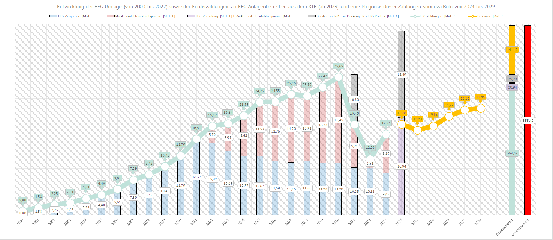 Die prognostizierten Werte ab dem Jahr 2024 basieren auf der Mittelfristprognose des ewi zu Köln. Für das Jahr 2021 schoß der Bund (also der deutsche Steuerzahler) 10,8 Mrd. € zur EEG-Umlage hinzu. Dieser Bundeszuschuß stellte sicher, dass das EEG-Konto für das Jahr 2022 wieder einen positiven Stand aufwies. Die stark gesunkene Markt- und Flexibilitätsprämie im Jahr 2022 gegenüber dem Jahr 2021 ist darauf zurückzuführen, dass im Jahr 2022 die Marktpreise für Strom aufgrund der Energiekrise erheblich gestiegen waren. So lag der durchschnittliche Monatsmarktwert bei Solarstrom im Jahr 2022 bei 22,306 ct/kWh gegenüber einem Monatsmarktwert von 7,552 c7/kWh im Jahr 2021. Diese hohen Marktpreise führten dazu, dass die Marktprämie, die als Differenz zwischen dem anzulegenden Wert und dem Marktwert berechnet wird, signifikant sank. Mit einem sinkenden Monatsmarktwert steigt auch wieder die vom Steuerzahler an die Betreiber von EE-Anlagen zu zahlende Vergütung (Marktprämie).