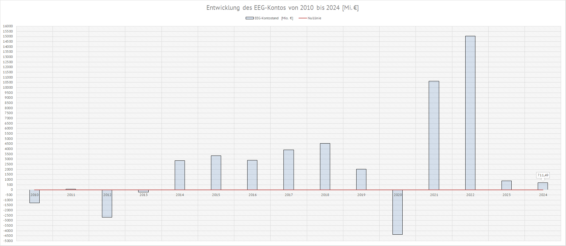 Die untere Grafik zeigt die Entwicklung des EEG-Kontos an. Das EEG-Konto ist ein zentrales Element des Erneuerbare-Energien-Gesetzes (EEG) in Deutschland, das seit seiner Einführung im Jahr 2000 die Förderung erneuerbarer Energien regelt. Es funktioniert ähnlich wie ein Bankkonto, auf dem Einnahmen und Ausgaben im Zusammenhang mit der Einspeisung von Strom aus erneuerbaren Quellen verbucht werden. Einnahmen: Die Erlöse stammen aus dem Verkauf von Strom, der an der Börse vermarktet wird. Diese Einnahmen werden auf der Haben-Seite des EEG-Kontos verbucht. Die Höhe dieser Erlöse kann stark schwanken, abhängig von den aktuellen Marktpreisen für Strom. Ausgaben: Auf der Soll-Seite werden die Vergütungen für Betreiber von Anlagen zur Erzeugung erneuerbarer Energien (wie Photovoltaik, Windkraft und Biomasse) erfasst. Diese Betreiber erhalten eine feste Vergütung oder eine Marktprämie für jede eingespeiste Kilowattstunde. |